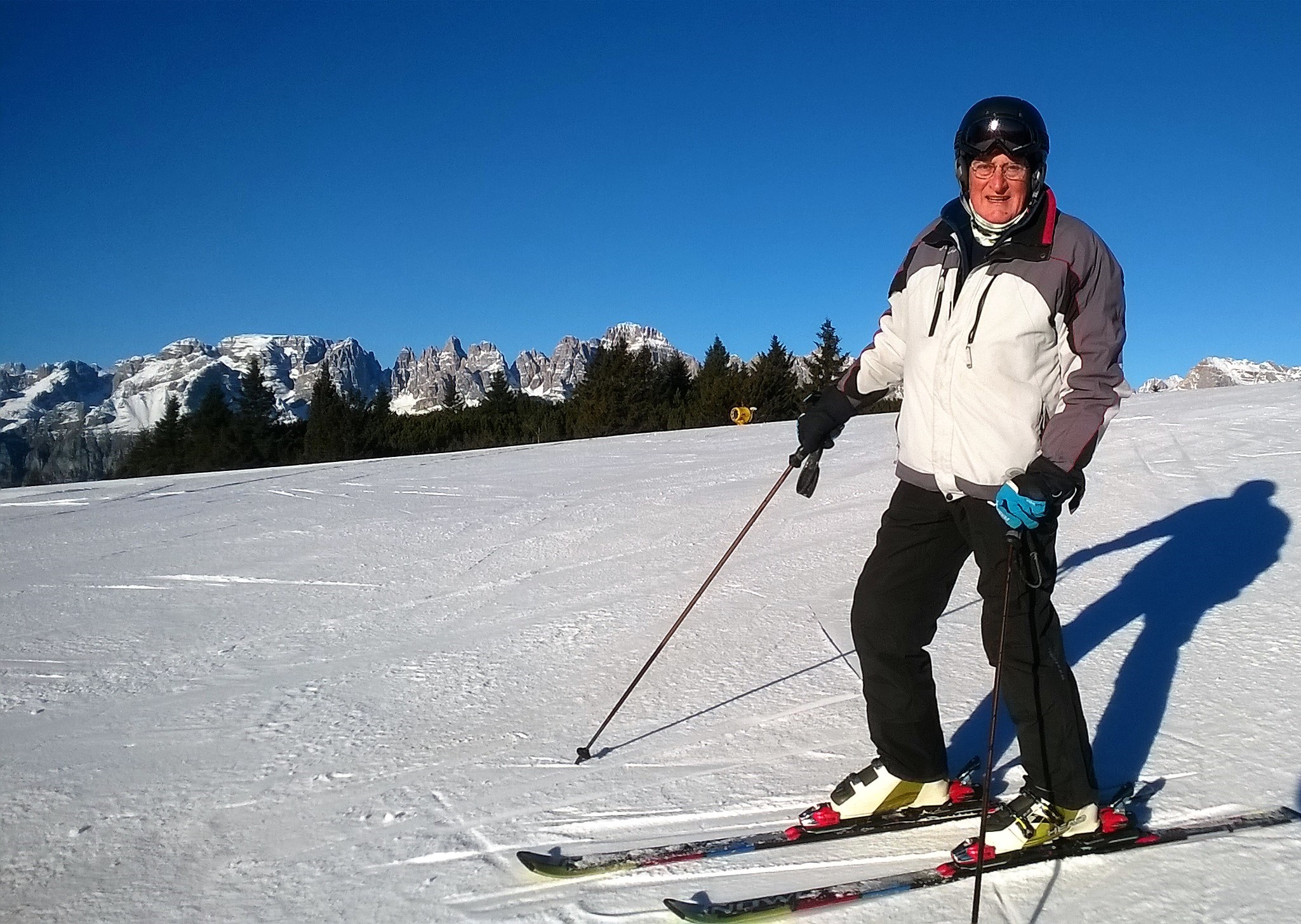 Ecco, ora ho la coscienza a posto: posso iniziare la stagione sciistica! In Paganella. Non nevica su tutto l’arco alpini ma la neve c’è! Sullo sfondo il Brenta. Da sinistra: Cima Tosa, Brenta Alta, Campanil Basso, Sentinella, Campanile Alto, Sfulmini, Torre, etc..)
