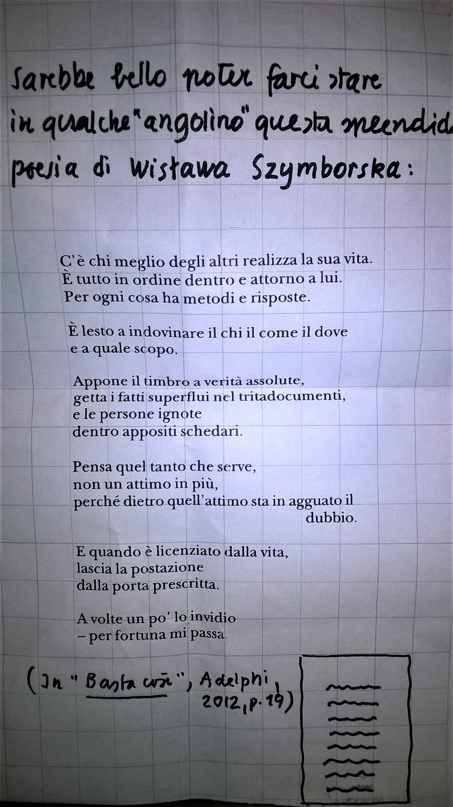 Salutiamo Marcello che ci regala una copia della poesia che ci ha appena letto. Probabilmente parte per il suo paese natio, Balbido-il Paese Dipinto (Giudicarie Esteriori) per via dei suoi murales, paese dove ogni domenica mattina alle 10,00 dice Messa. Un mio amico, presente con la moglie a Restart la mattina e a Messa il pomeriggio, dice: “Oggi ho respirato ossigeno due volte”. Io pure: ascoltare Marcello è nutrimento per lo spirito, un passo in più verso la vera Fede, una iniezione di umanità , di comprensione, di speranza. Grazie, Marcello, bentornato! Good restart to you too …