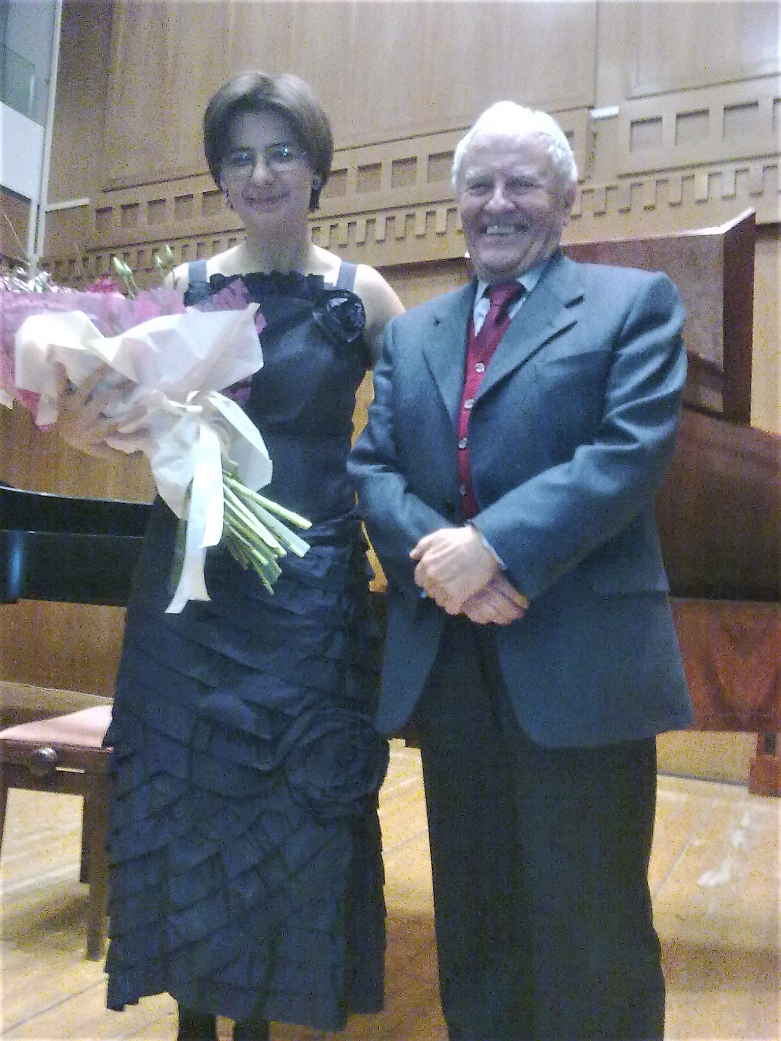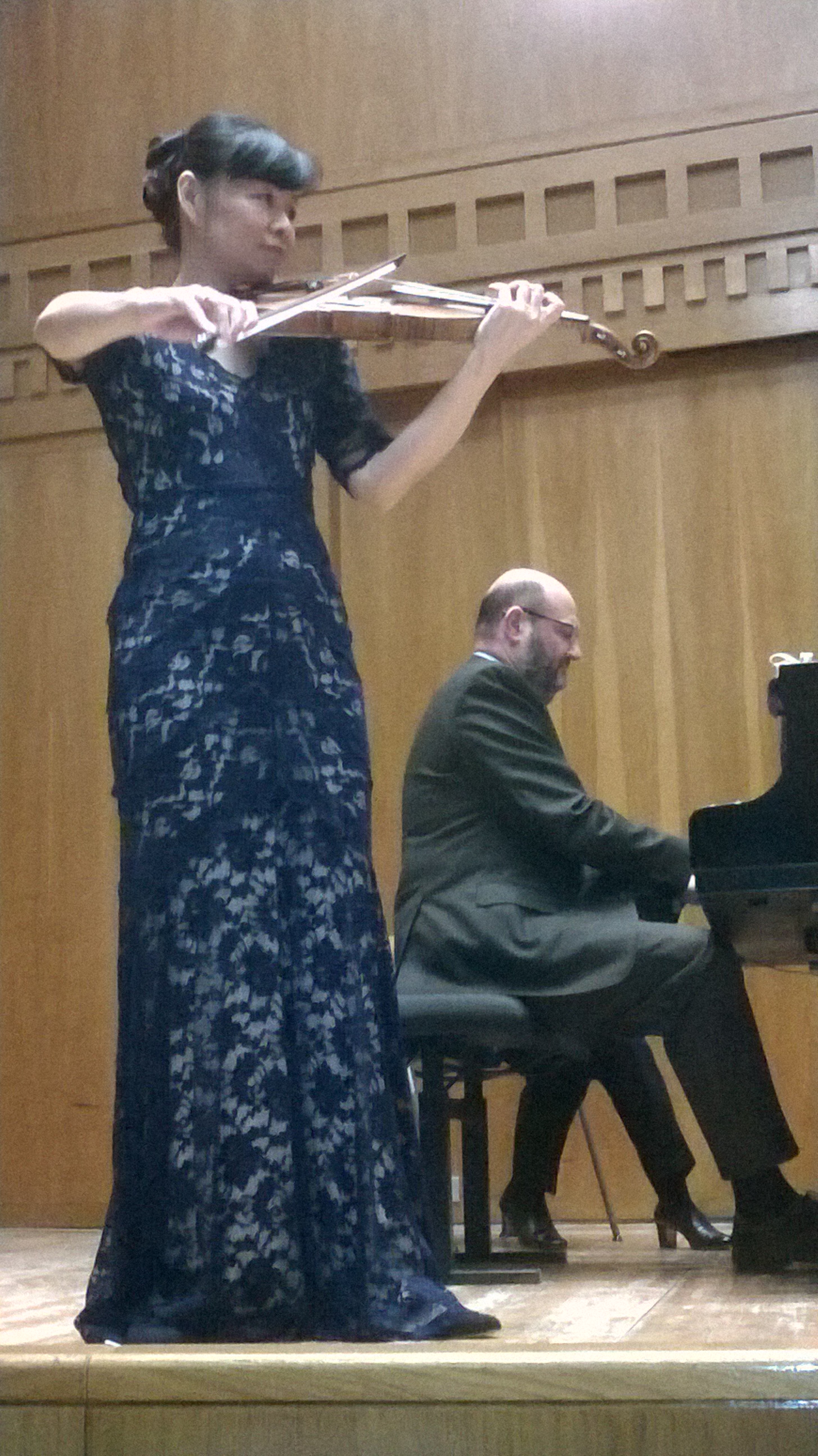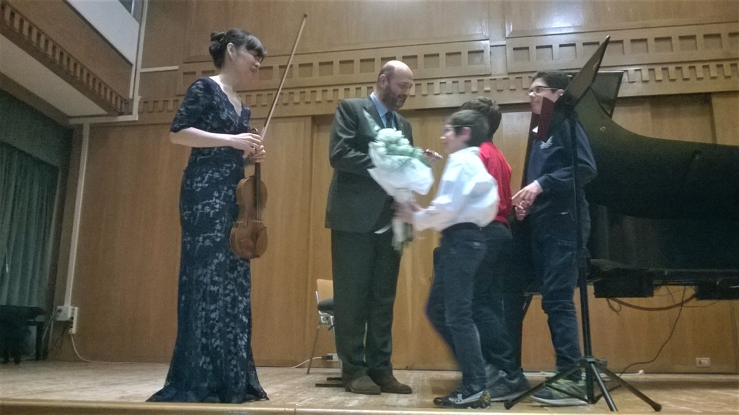 Ma veniamo al concerto di ieri pomeriggio, organizzato dalla “sua†associazione, nel “suo†Conservatorio, da “suo†successore, il Professor Franco Ballardini, eseguito dal “suo” vecchio amico Prof. M° Edoardo Maria Strabbioli al piano e dalla violinista Bin Huang, la numero uno in Cina e probabilmente nel mondo. Presenti in sala la moglie Maria Grazia, una delle tre figlie, Elisabetta con tre dei cinque nipoti.