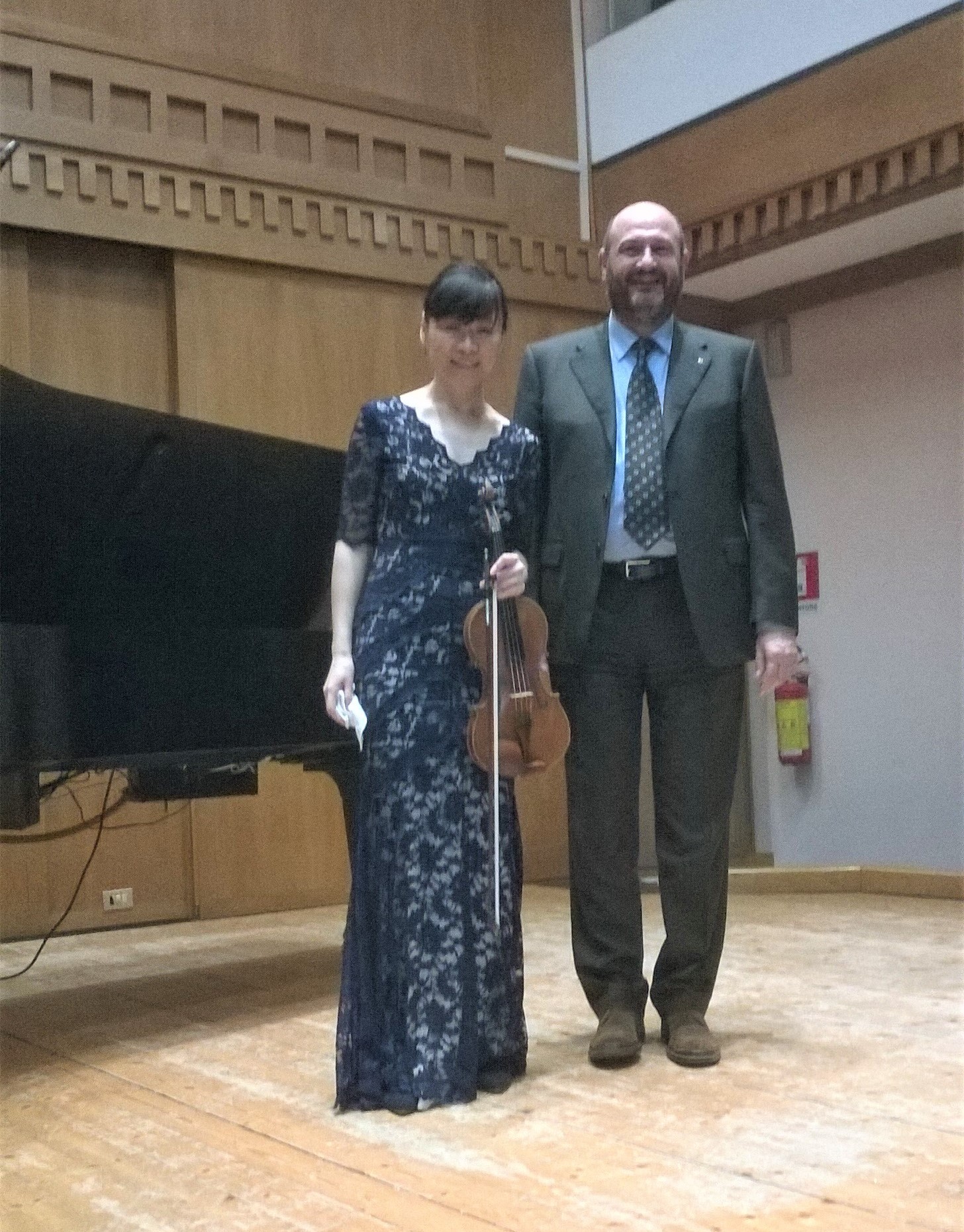 Ottima anche la prestazione del M° Strabbioli, degna consonanza a tanto violino. Strabbioli, che per decenni ha insegnato in questo Conservatorio, ha testimoniato un ricordo affettuoso di Ruggero e del suo entusiasmo per la musica e la convivialità , regalandoci insieme a Bin due bis: una romanza di Clara Schumann ed uno scherzo di Brahms.