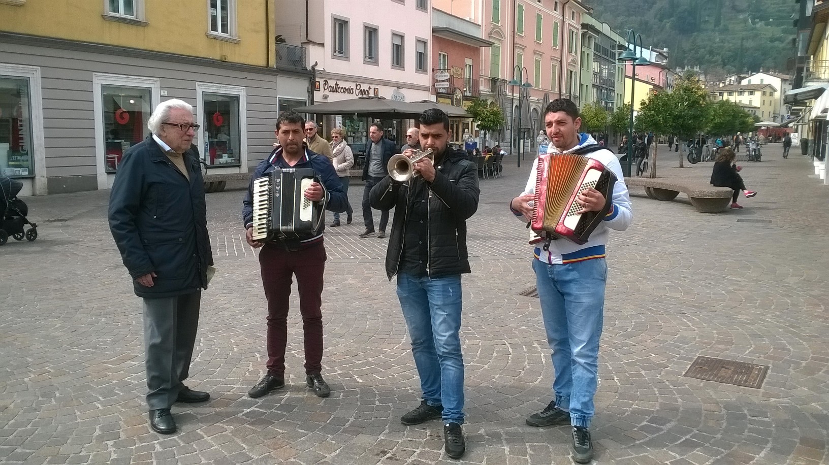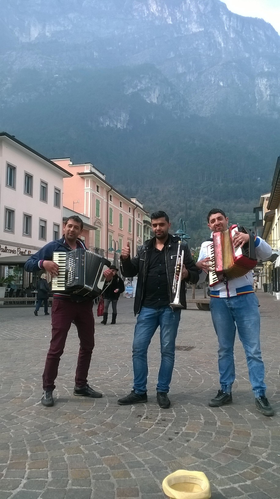 Mattina dopo, a Riva del Garda. Passeggio. Incontro il M°  Riccardo Giavina che ascolta con interesse tre suonatori di strada. Tre giovani moldavi che per me “suonavano bene” ma per Riccardo (un amico, ci chiamiamo così) suonavano ottimamente. Mi fermo, ascolto, applaudo, faccio un’offerta, scatto due foto.