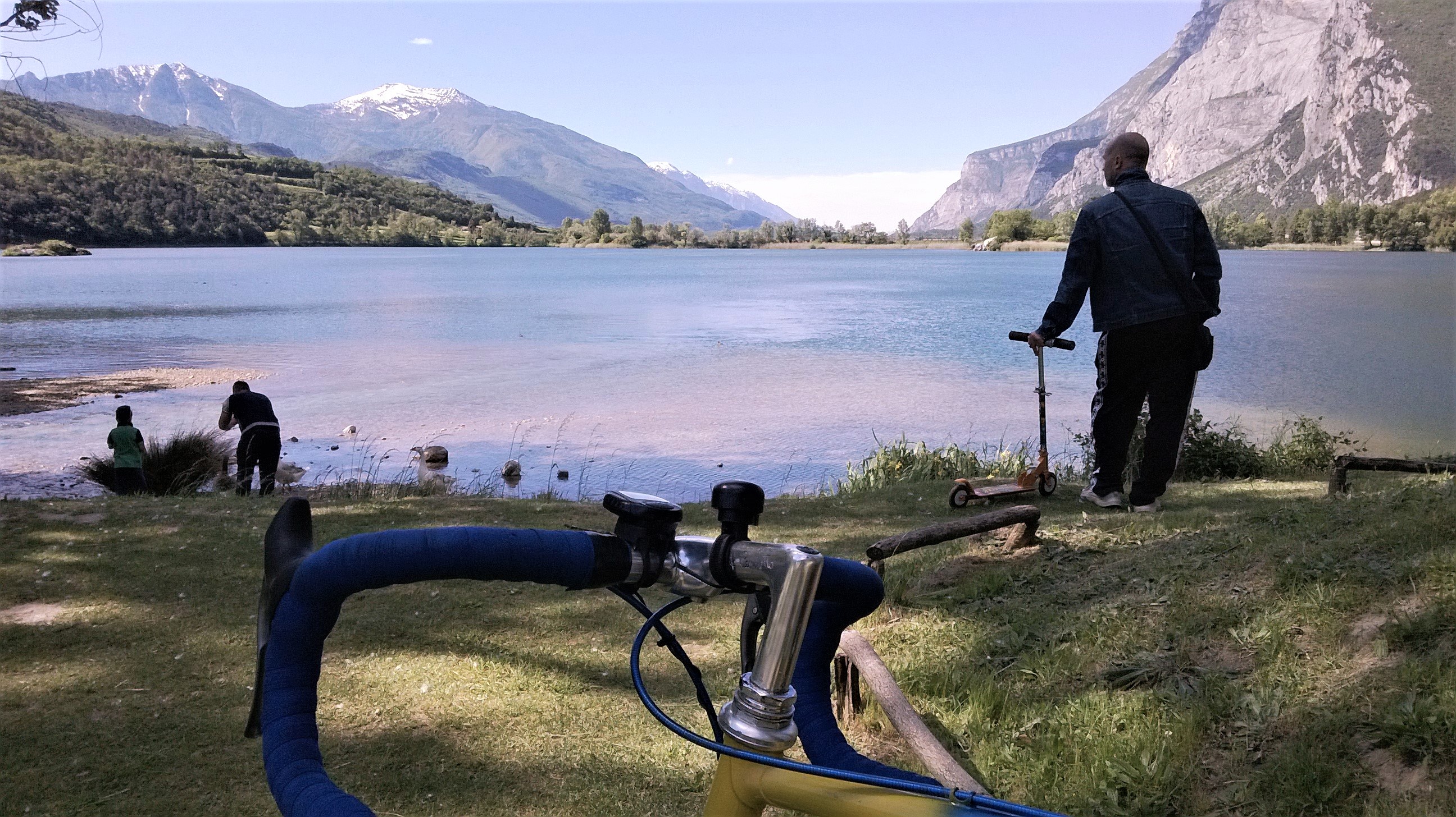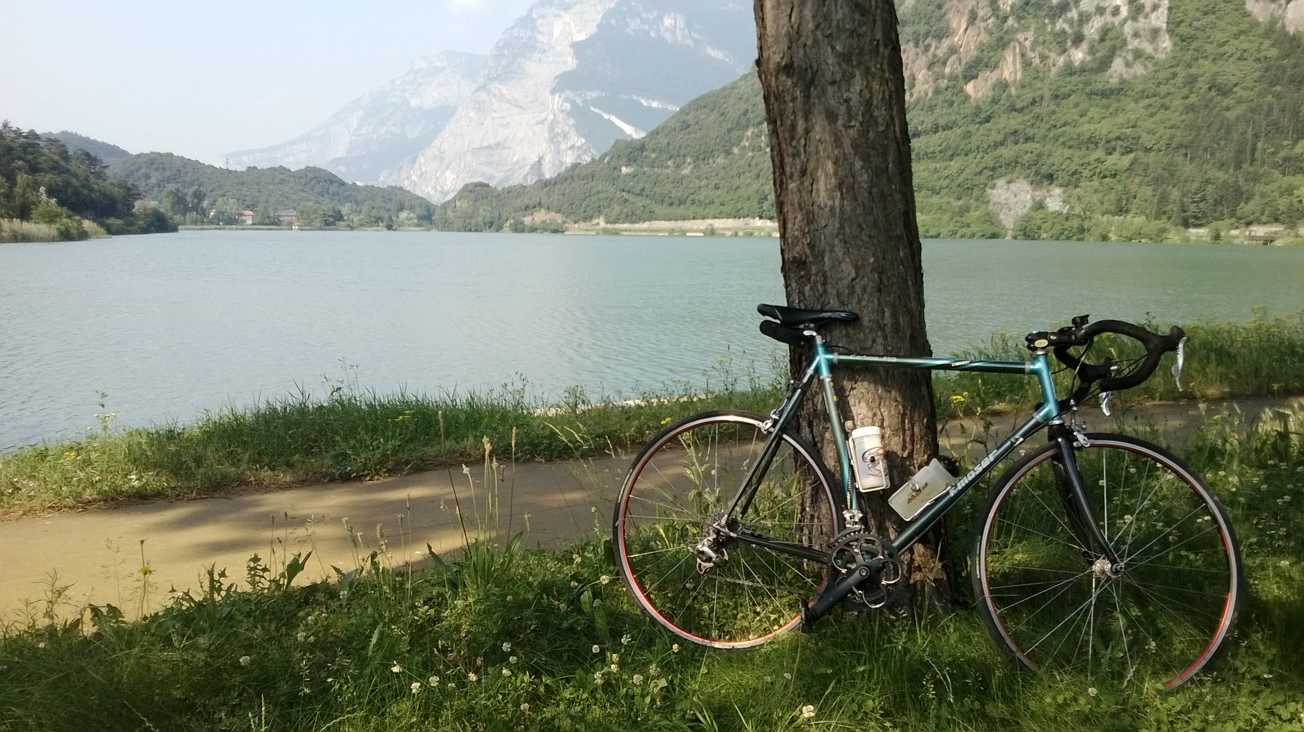 - Sarche: stare a sinistra, costeggiare il cimitero per strade interne, inserirsi verso est in via Vallonga (marciapiede pedalabile), curva a 90° e destra, costeggiare il cementificio, procedere su strada poco frequentata costeggiando il bel fiume che fa compagnia, superare località Pergolese, raggiungere il Lago di Cavedine: Centro velico, Bar, WC dal mio amico Andrea Danielli (presentarsi: siamo amici di Riccardo!). Sosta. Indi due possibilità :
