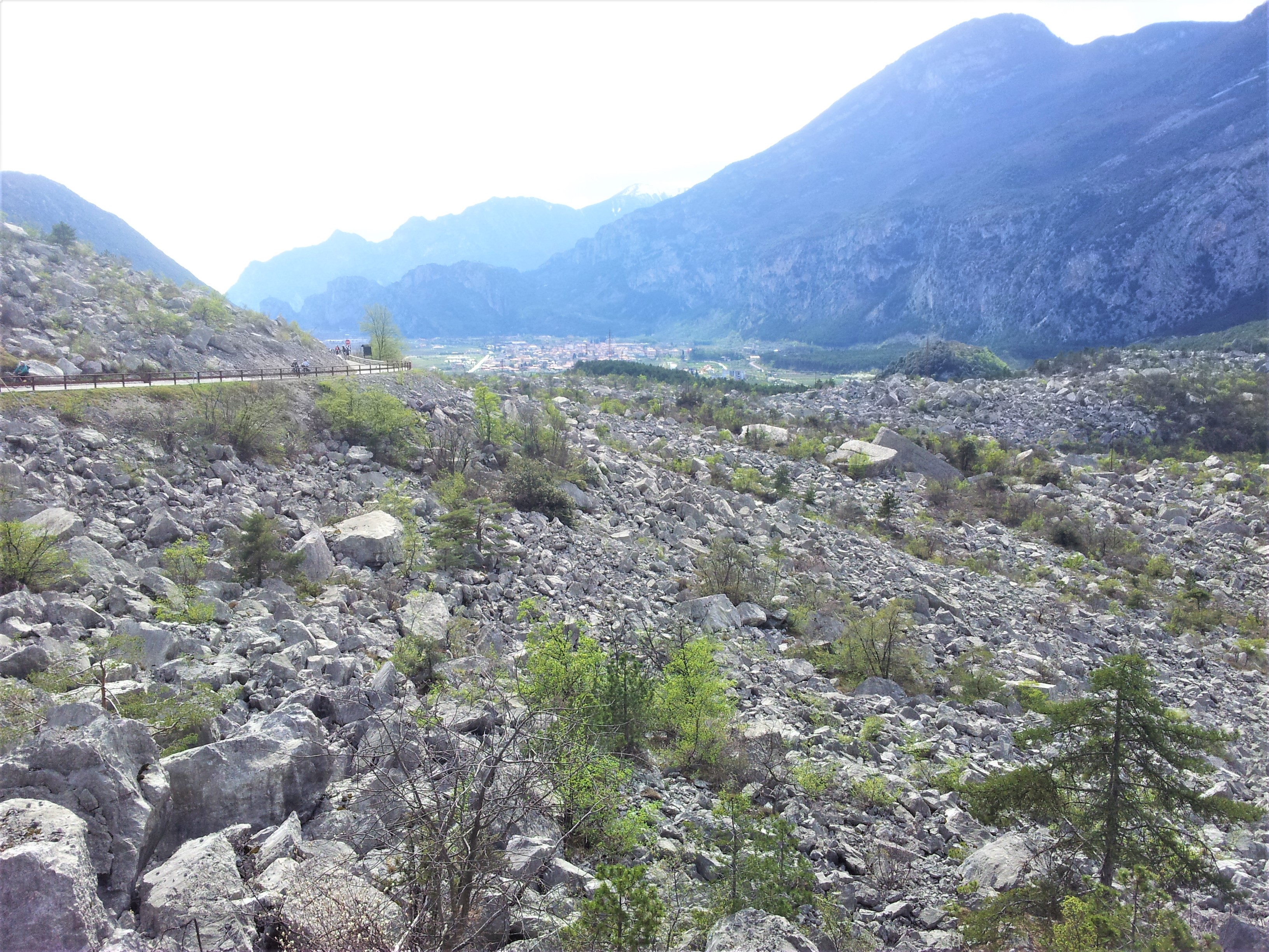 - oppure si finisce di costeggiare verso sud il lago di Cavedine su strada poco frequentata, si sale per circa 1,6 km al 3%, indi discesone costeggiando le marocche (discesa leggera, strada non molto larga – foto a fianco); indi seguendo la strada (larga e molto veloce) che scende dal castello di Drena, si plana su Dro.