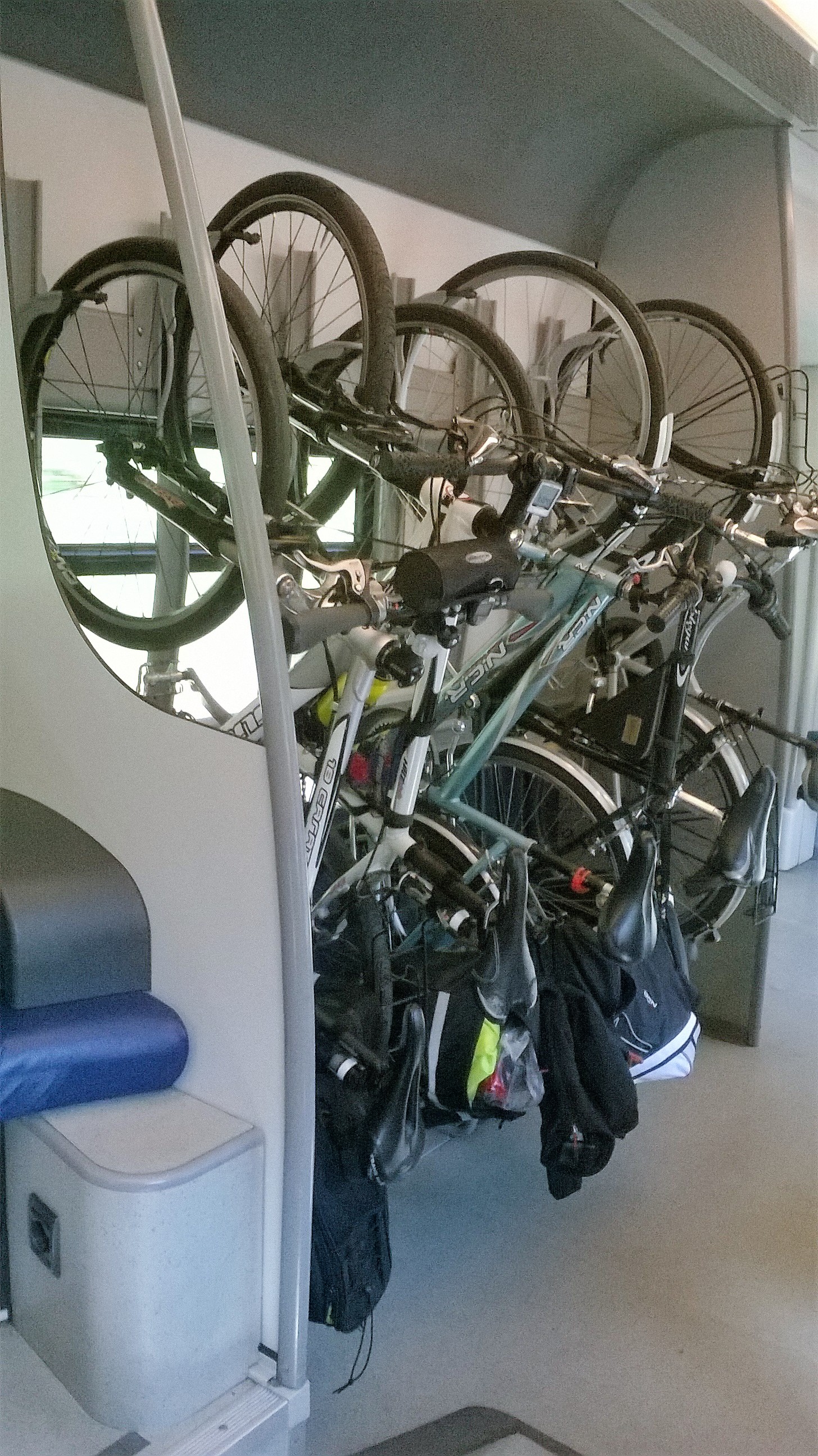 Pfuiii … è andata! Ma, si deve prenotare? Si, al n. 0461 821000 entro le 16,00 del giorno prima. Poi, in luglio e agosto, i posti bici disponibili saranno 32. Ah … ho capito, grazie. In realtà siamo solo 5: un posto bici è ancora disponibile. Poco dopo, ad una fermata intermedia, due olandesi con due bici: “No, solo una …†Di fronte al loro stupore: “Evvabbè, caricatene due ma una la legate al maniglioneâ€. E’ andata anche per loro.