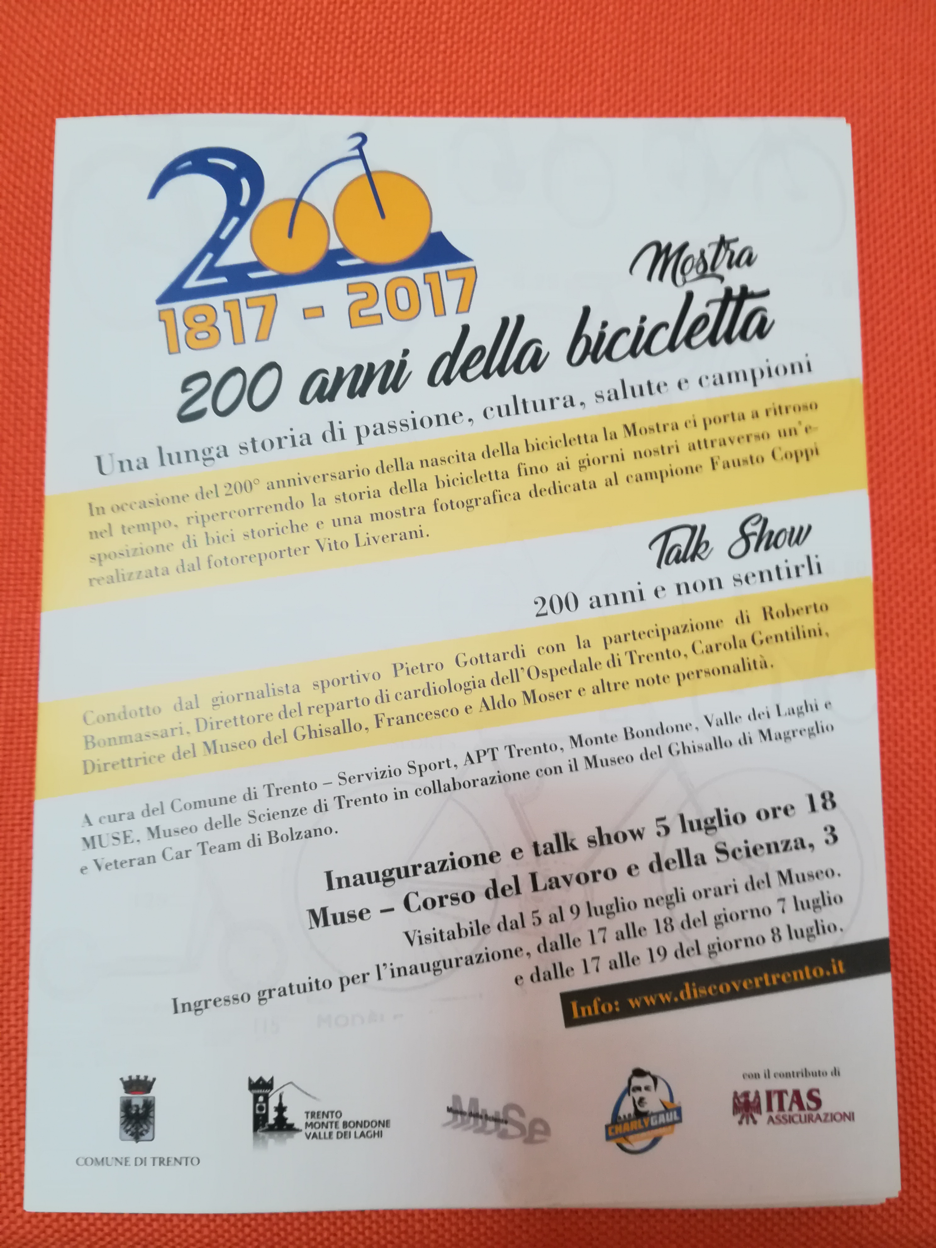 Io, 6 luglio 2017: ieri pomeriggio con una nutrita delegazione FIAB siamo stati all’inaugurazione della mostra per i 200 anni della bicicletta, al Muse di Trento. Peccato che non ci sia venuto in mente di avvisare per tempo l’organizzazione che in quello stesso momento Lucia aveva raggiunto Bruxelles. Ho provato, all’ultimo momento, a fare inserire l’evento, ma giustamente Pietro Gottardi, il giornalista sportivo de L’Adige conduttore dell’evento, mi ha fatto notare come esso fosse già affollatissimo di interventi (durati complessivamente quasi due ore!). Comunque non è escluso che Gottardi – come mi auguro – prenda l’iniziativa di dare anche un rilievo anche trentino all’impresa di Lucia, la quale verrà spesso a Trento ospite nostra. Infatti il ruolo dei Fiabbini Trentini e Sudtirolesi durante la tappa regionale di Lucia non è stato da poco (si vedano sopra i resoconti).