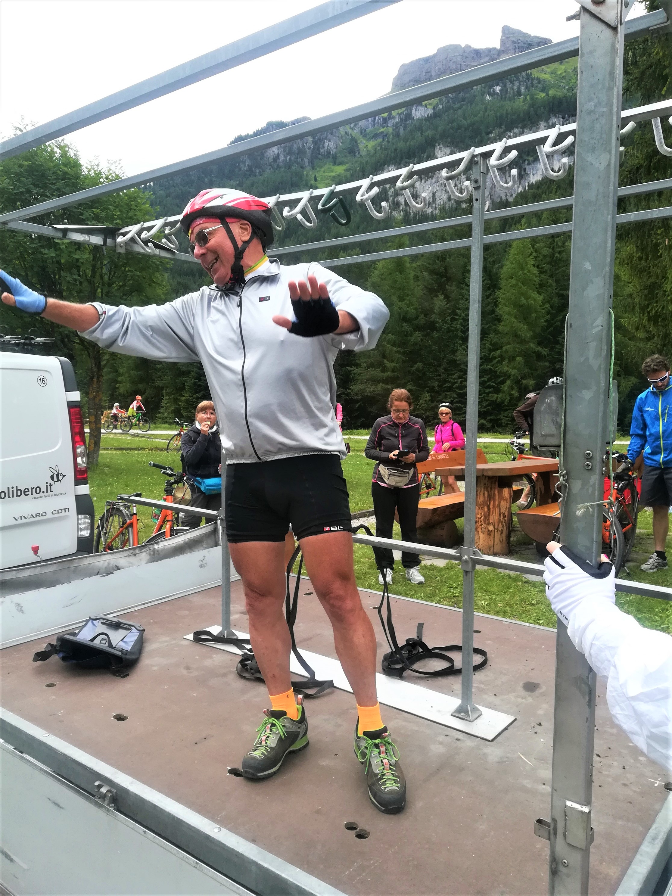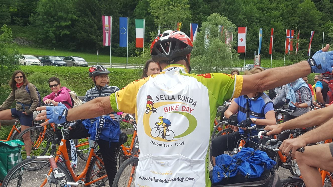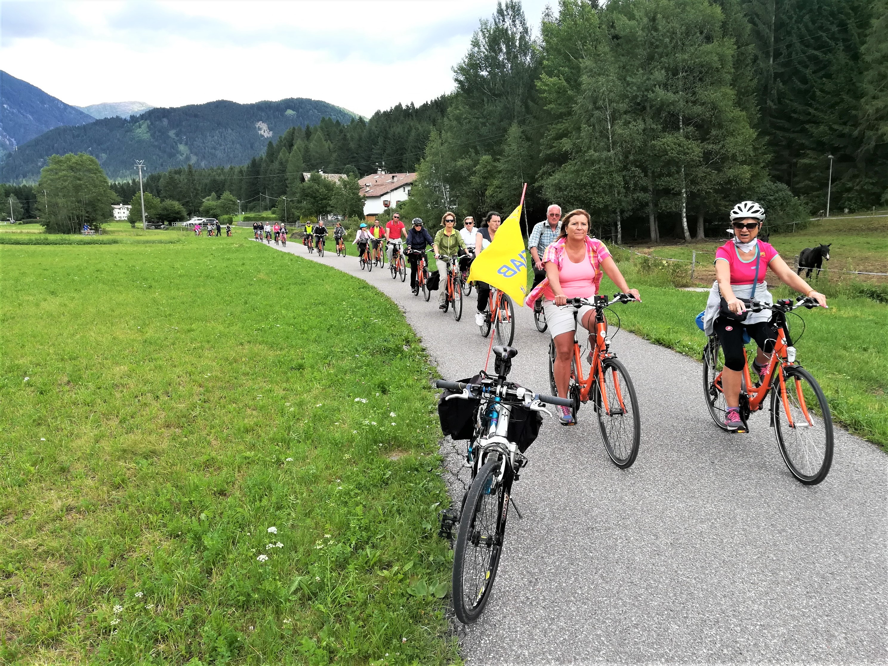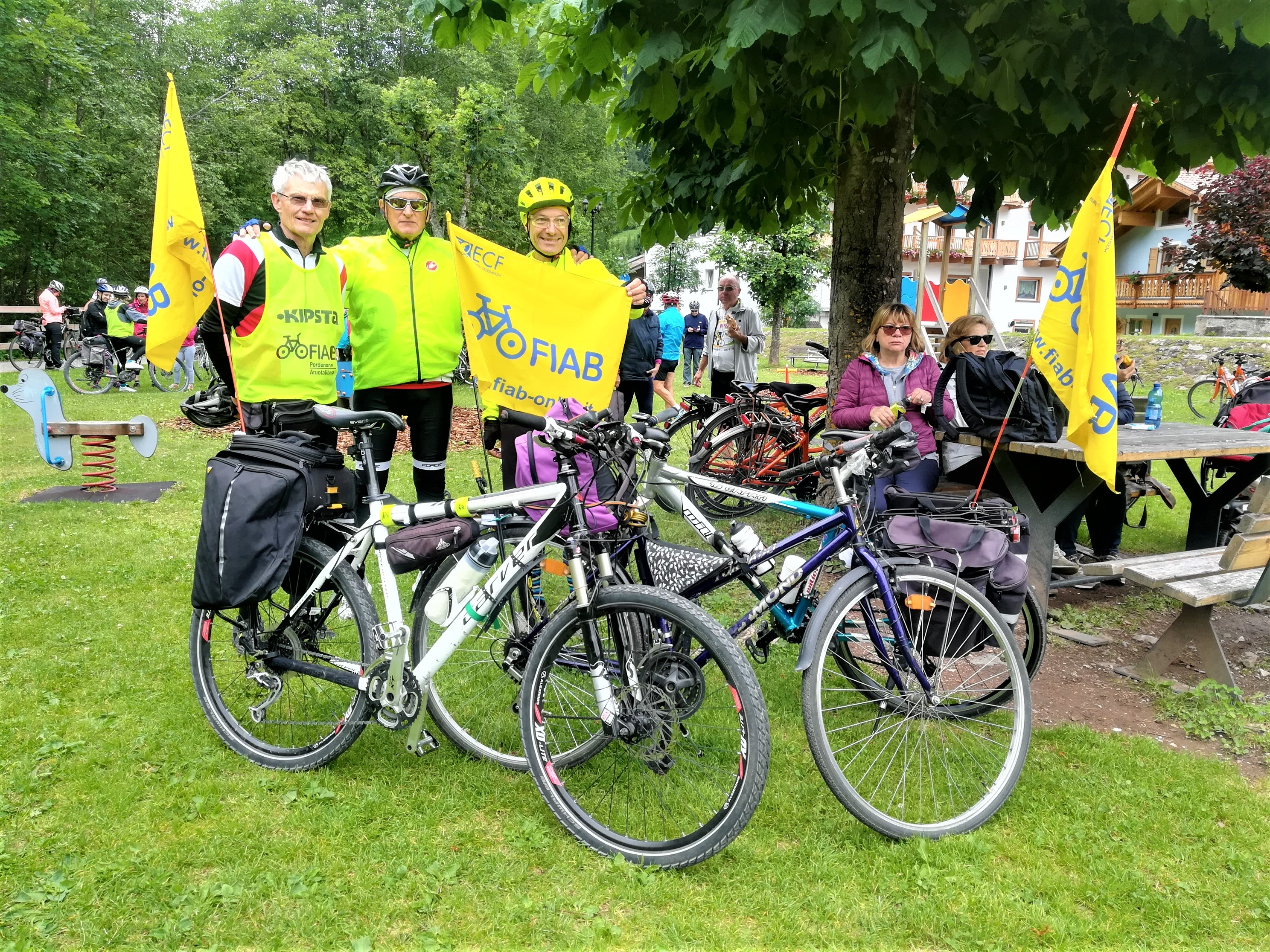 Tempo così e così, a Canazei fa freddino, man mano che scendiamo ci scaldiamo. Ci fermiamo in un parco pubblico a mangiare (al sacco) ed ecco la sorpresa: una … no … due altre bandierone FIAB arrivano sul nostro prato! Riccardo, Fausto! Giorgio! Sono gli amici colleghi Fiabbini di Pordenone che in un recente passato abbiamo accompagnato in una situazione analoga! Festa! 40 noi, 40 loro, un bel Gruppone Fiab!