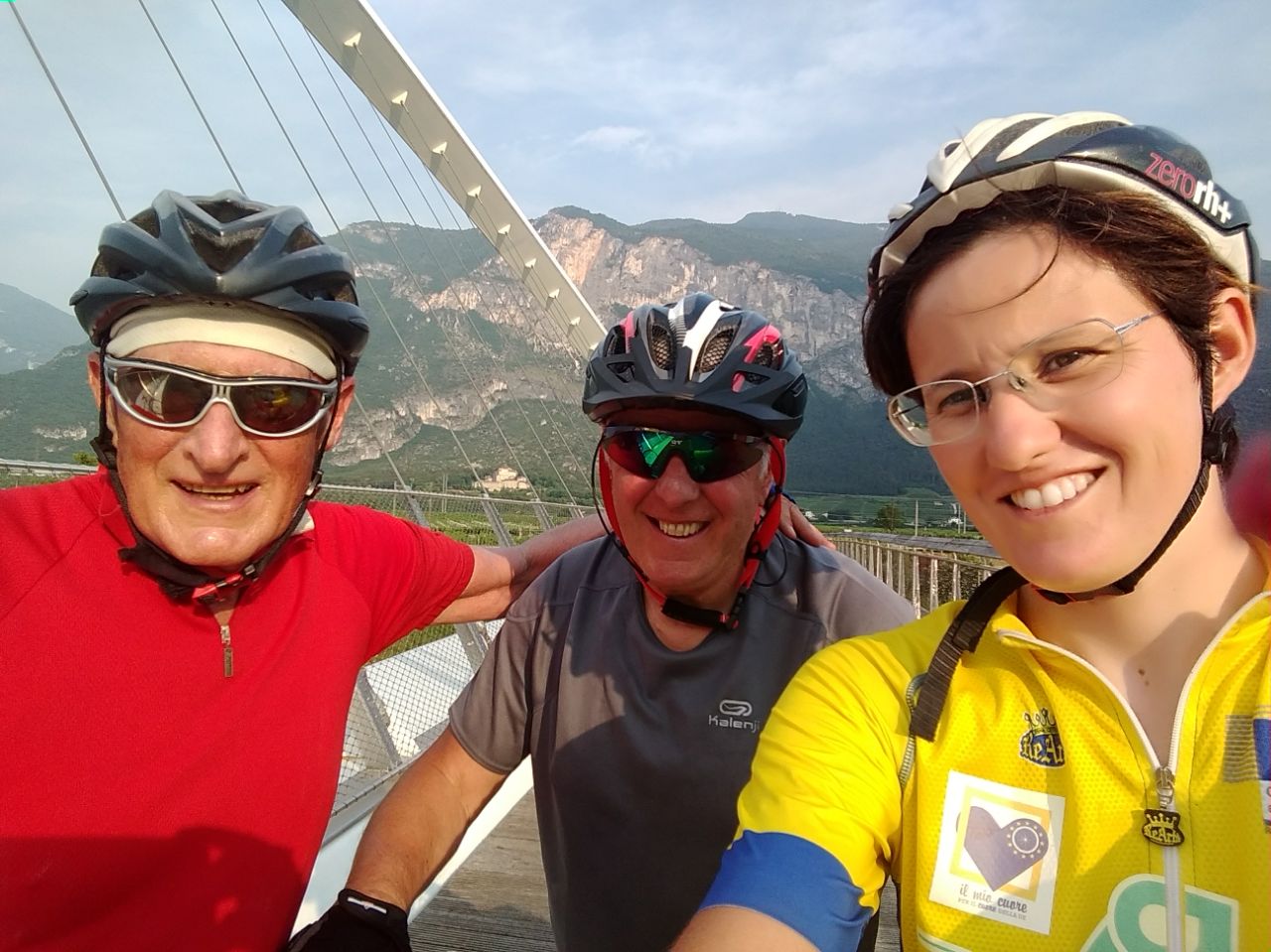 Il primo contatto a pedali di Lucia con Fiab Trento avvenuto pochi km a nord di Borghetto (qui, insieme al collega Claudio, siamo a Mori): andandole incontro da Trento, io l’ho accompagnata fino a Bolzano (tot. 160 km)