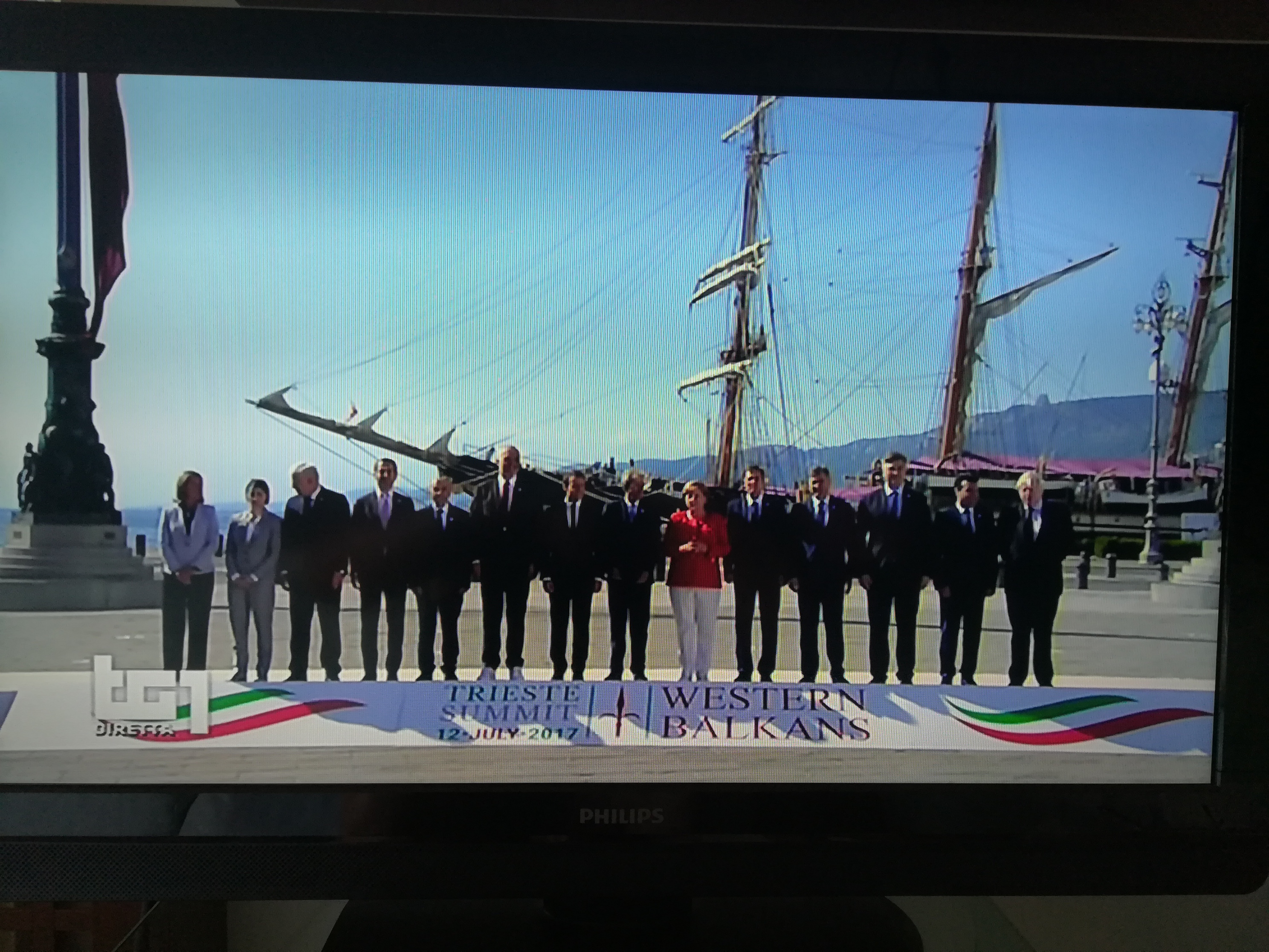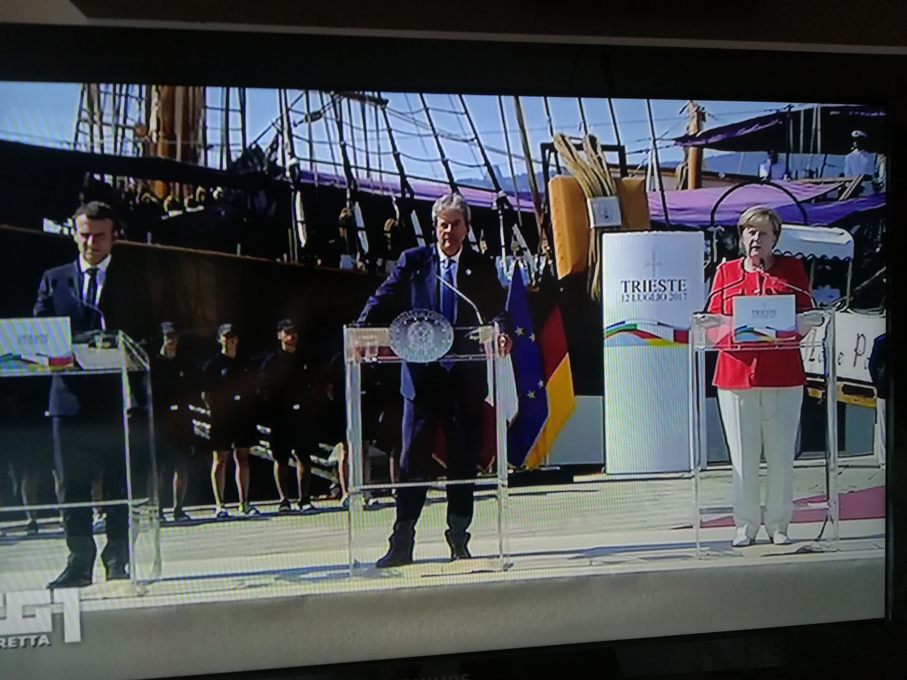 Già , “il†Palinuro perché si sottintende il termine “legnoâ€, il legno Palinuro, una “nave golettaâ€, il secondo veliero della nostra marina militare dopo il Vespucci e prima del Caroly. Il Palinuro ormeggiato al molo di Piazza dell’Unità di Italia a Trieste accoglie l’incontro a tre fra Italia, Germania e Francia. Buoni propositi per lo sviluppo, la cooperazione etc..