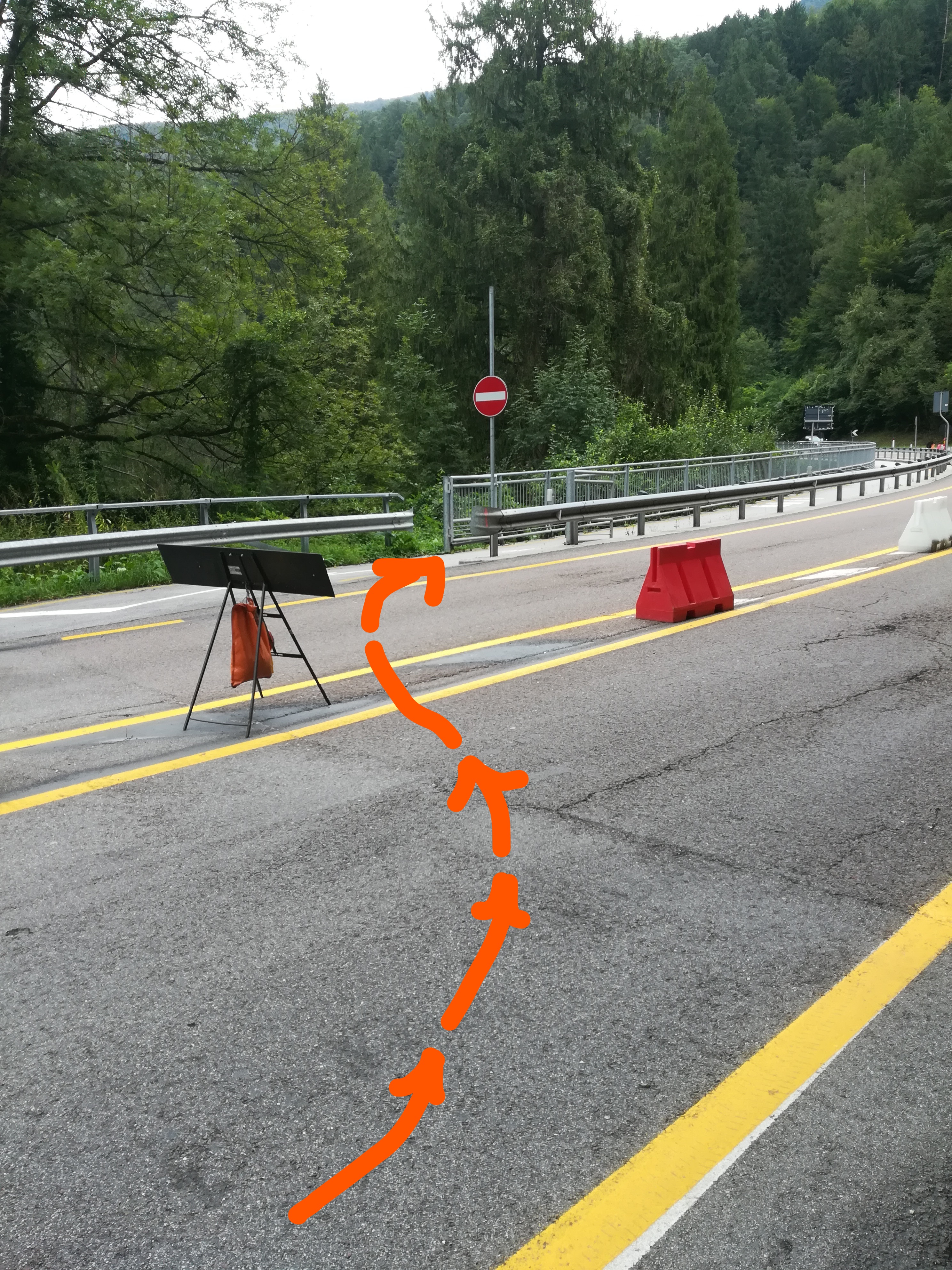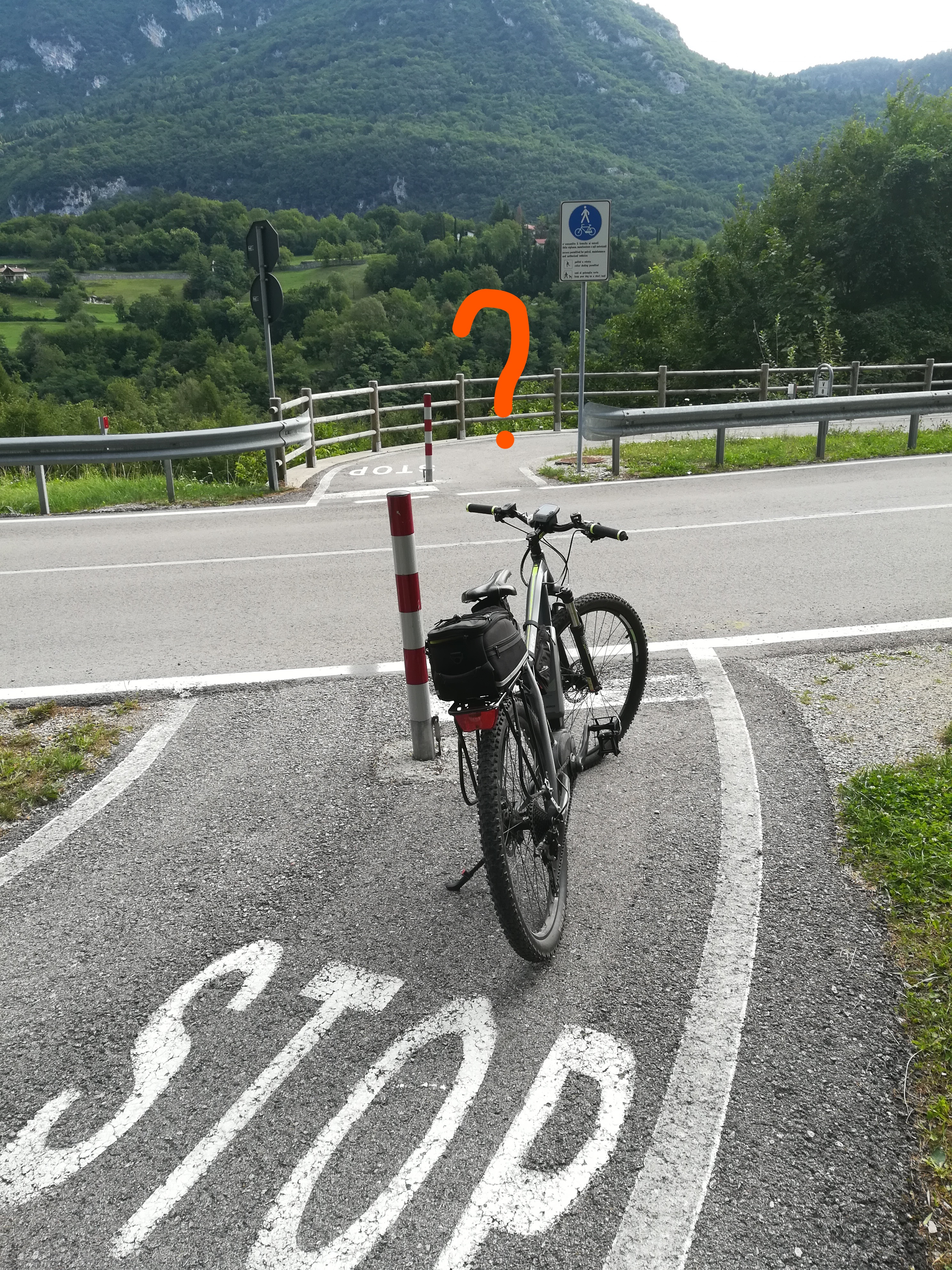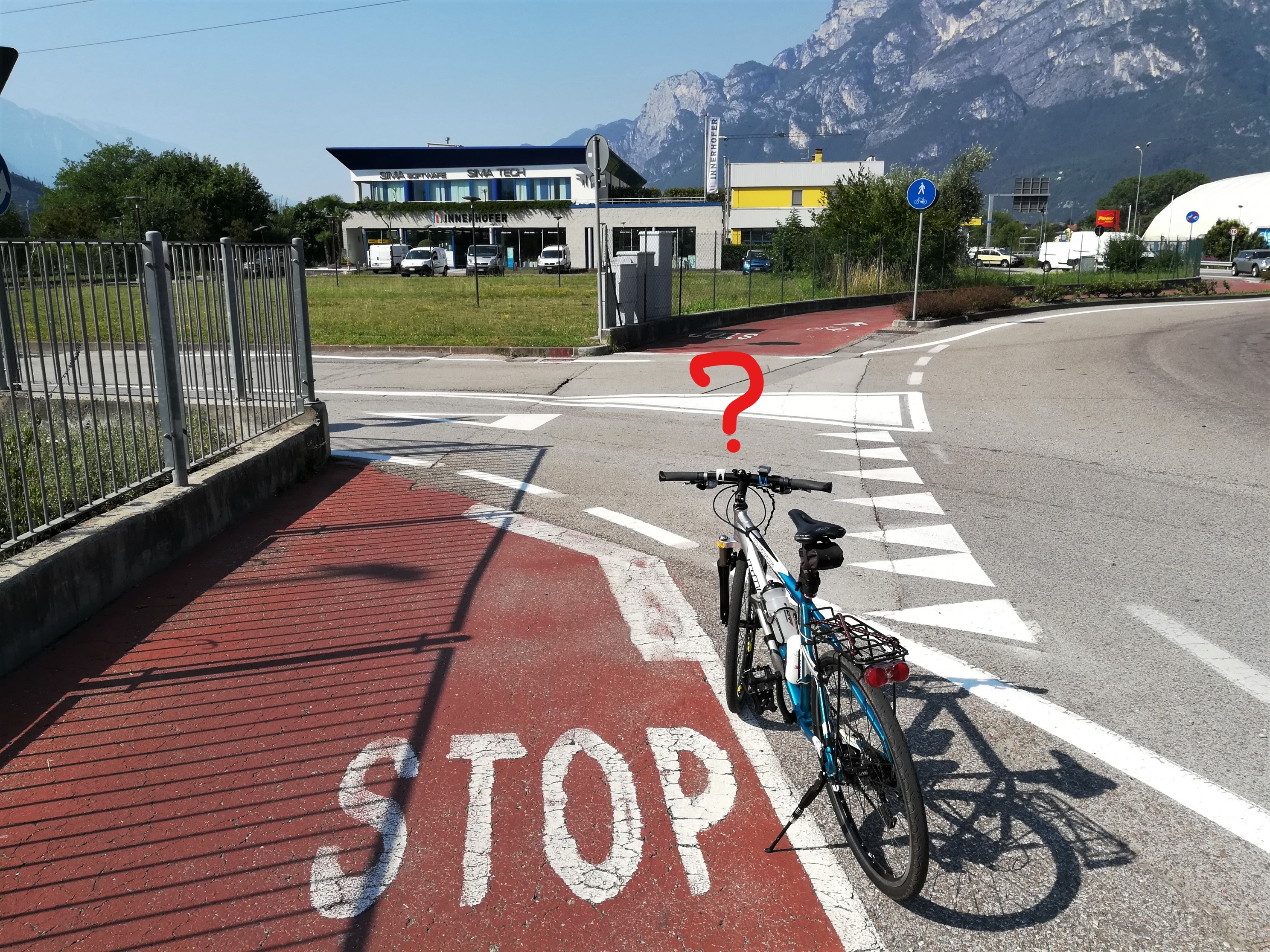 Qui ho utilizzato un poco di aiuto elettrico per raggiungere il tratto di ciclabile che costeggia la strada ex SS 237. Attenzione, seconda foto: l’immissione su questo tratto di ciclabile non è assistita da alcuna segnaletica orizzontale! Nella foto, l’accesso alla pista è là , in corrispondenza del divieto di transito per tutti, ciclisti compresi,  così se ci scappa il morto … noi ve lo avevamo detto! Una vera “talianada”!