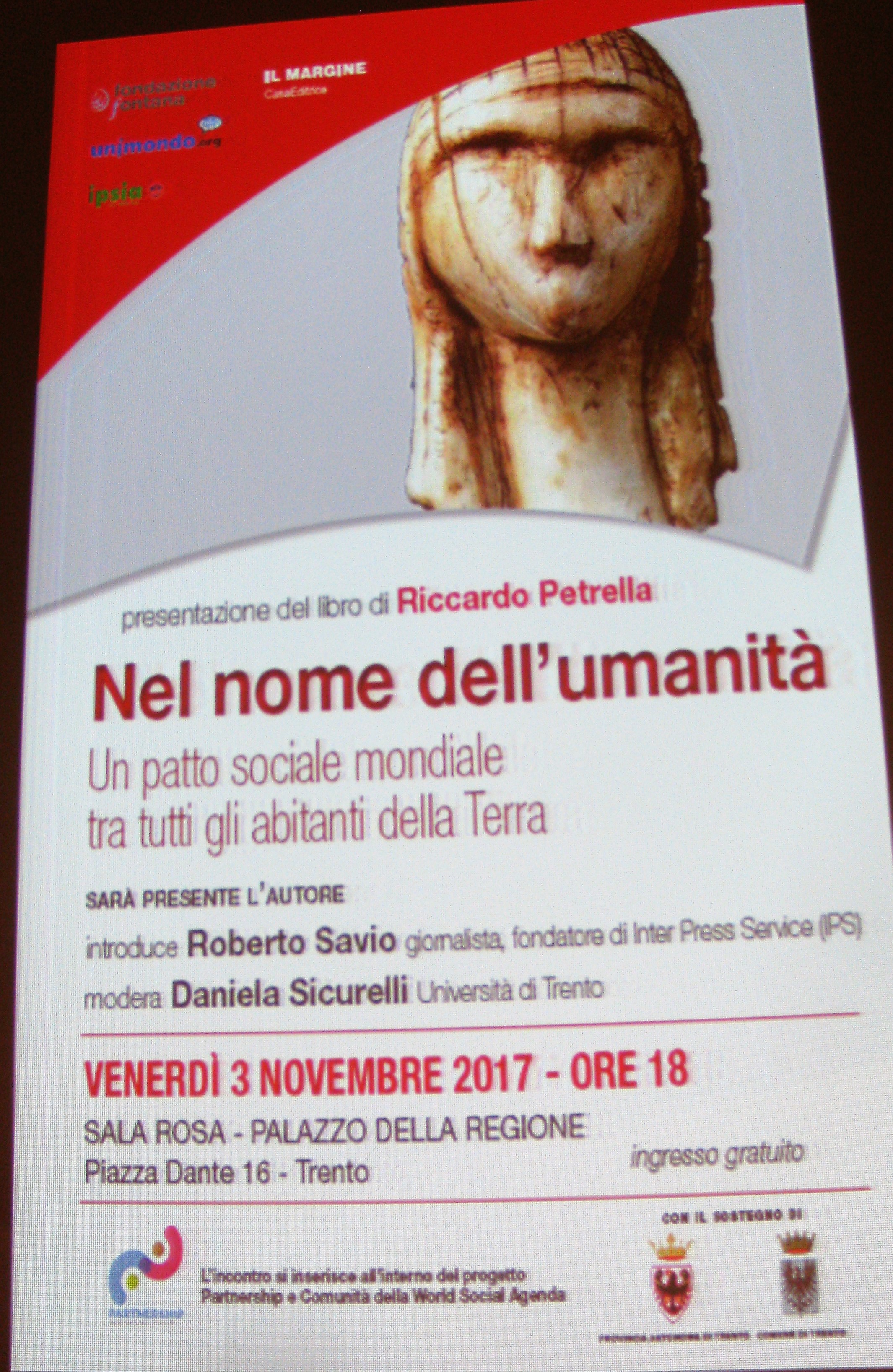Ieri sera. Sala Rosa del Palazzo della Regione. Un libro: “Nel nome dell’Umanità “. Riccardo Petrella, l’autore. La sala piena. Quo vadis Umanità ? Dove stiamo andando tutti? Riccardo Petrella, un libro, due sezioni: la pars destruens e la pars construens.