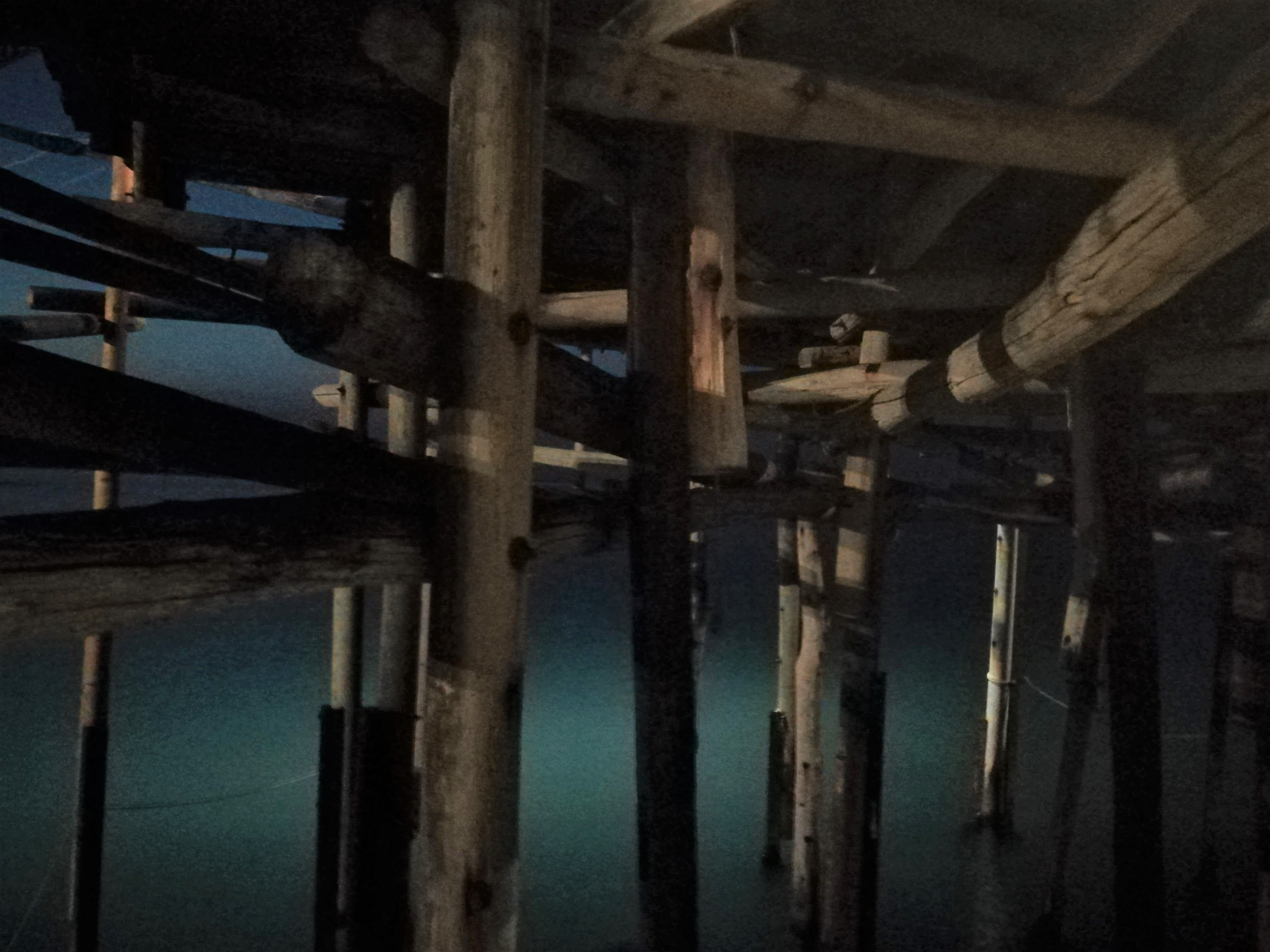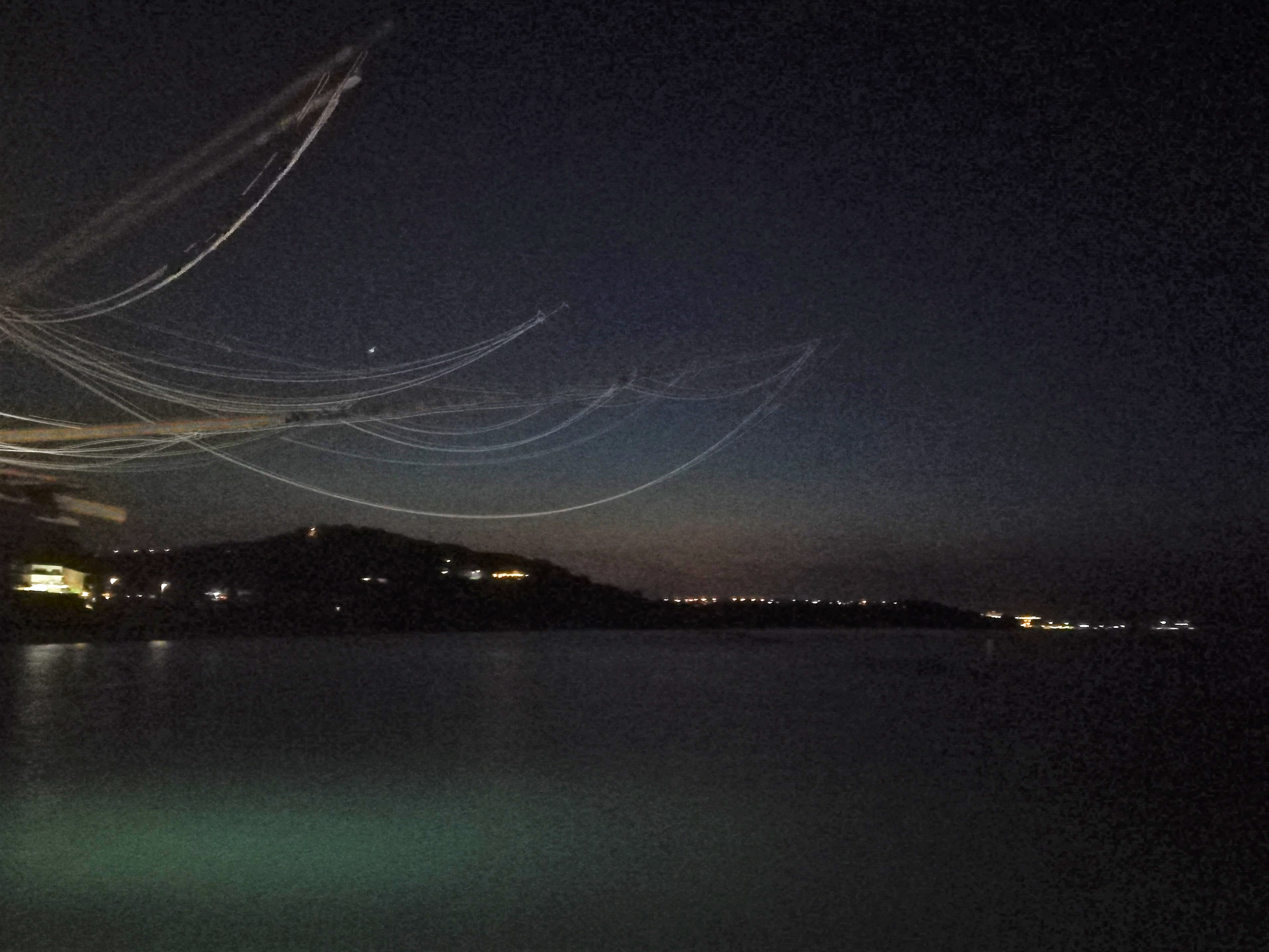Estate. Passeggiavo, una sera, lungo un molo a S. Vito Chietino (Chieti, Abruzzo). In tasca, la mia solita macchina fotografica: il telefonino. Due foto così, alla come viene viene … per pubblicarle qui sul post le ho un po’ schiarite, ho regalato loro un po’ di luce in più … Il trabucco è una costruzione in legno, una sorta di palafitta sul mare, dalla quale si calano in acqua grandi reti per la pesca del pese. Quando vengono tirate in secco, la notte, quelle reti pescano … le stelle!