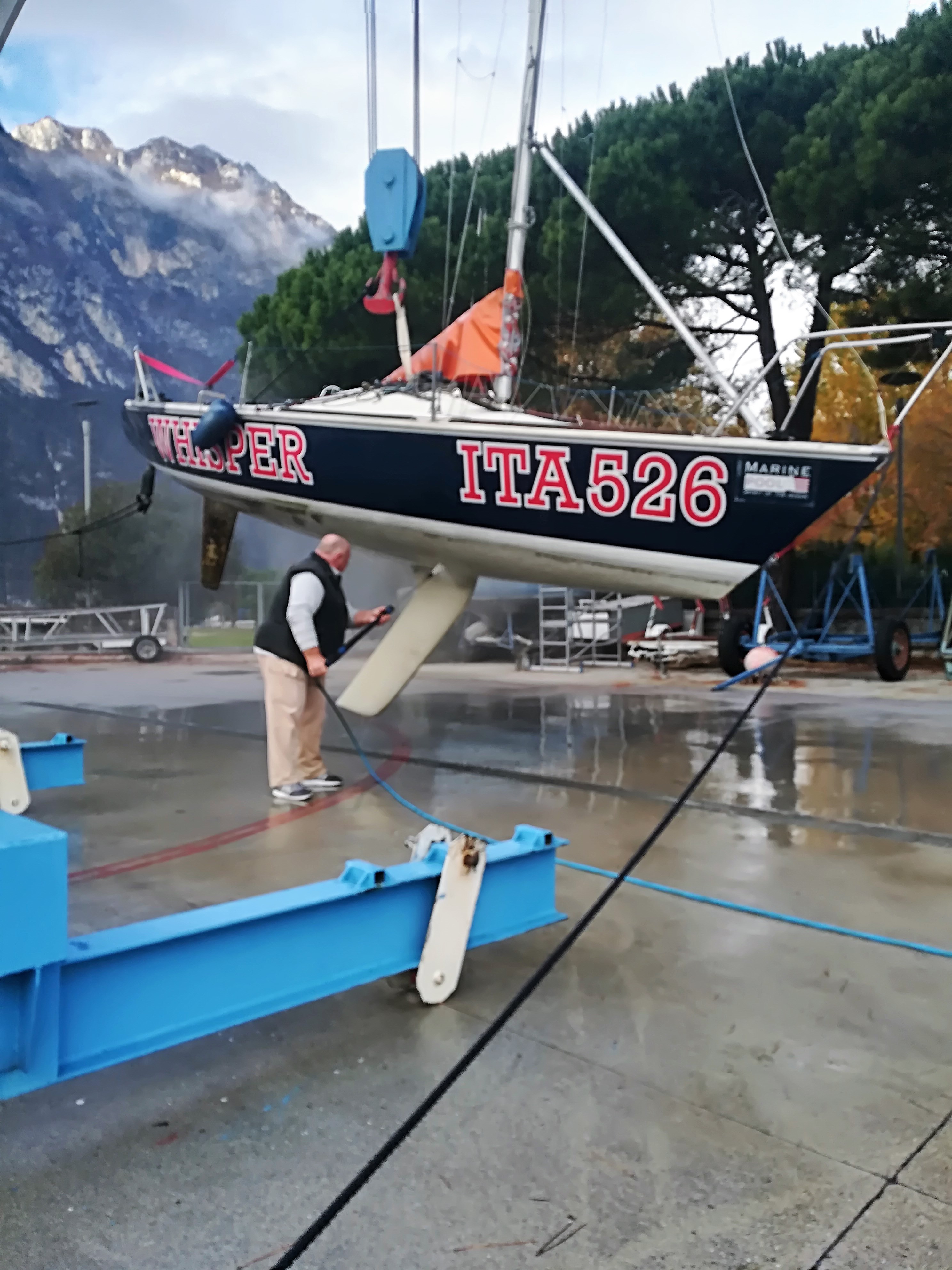 Dice, ok, queste sono le gioie. Ma i dolori? Eccomi a voi: i dolori sono quando mentre è tranquillamente ormeggiato, un gommone con un motore di 40 CV (ecco i motori!) si infila sotto il pontile dal lato opposto e lo sperona .. di prua! Ed ecco perché ora è in cantiere… e già che ci siamo diamo una bella pulita alla carena, rifacciamo l’antivegetativo nuovo e alcuni altri interventi minori. A presto dunque, Whisper, dopo che ti sarai rimesso in forma!