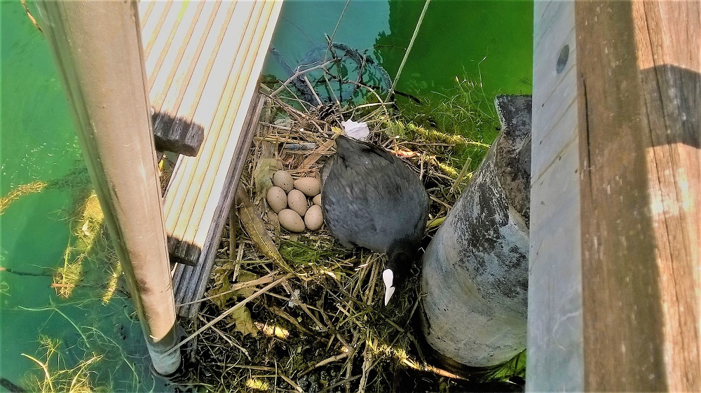 Questa mattina mi sono detto: dai, alleggerisci un po’ il discorso … vai a ripescar qualche bella foto, una un po’ particolare, ad esempio … maternità ? Si, visto che insieme a mia moglie sono in trasferta a Bologna (computer al seguito!) ad aiutare mia nuora, neo mamma da due settimane della piccola Bianca. Ed ecco che ho ripescato una foto di un’altra “quasi” neo mamma. La foto è di quest’estate, scattata dal pontile centrale del porto del Circolo Velico Fraglia Vela Riva a Riva del Garda. Una folaga ha fatto il suo nido sulla scaletta che dal pontile scende in acqua, per agevolare l’accesso alle barche ormeggiate. Il livello del lago è basso? Ed allora approfittiamone!