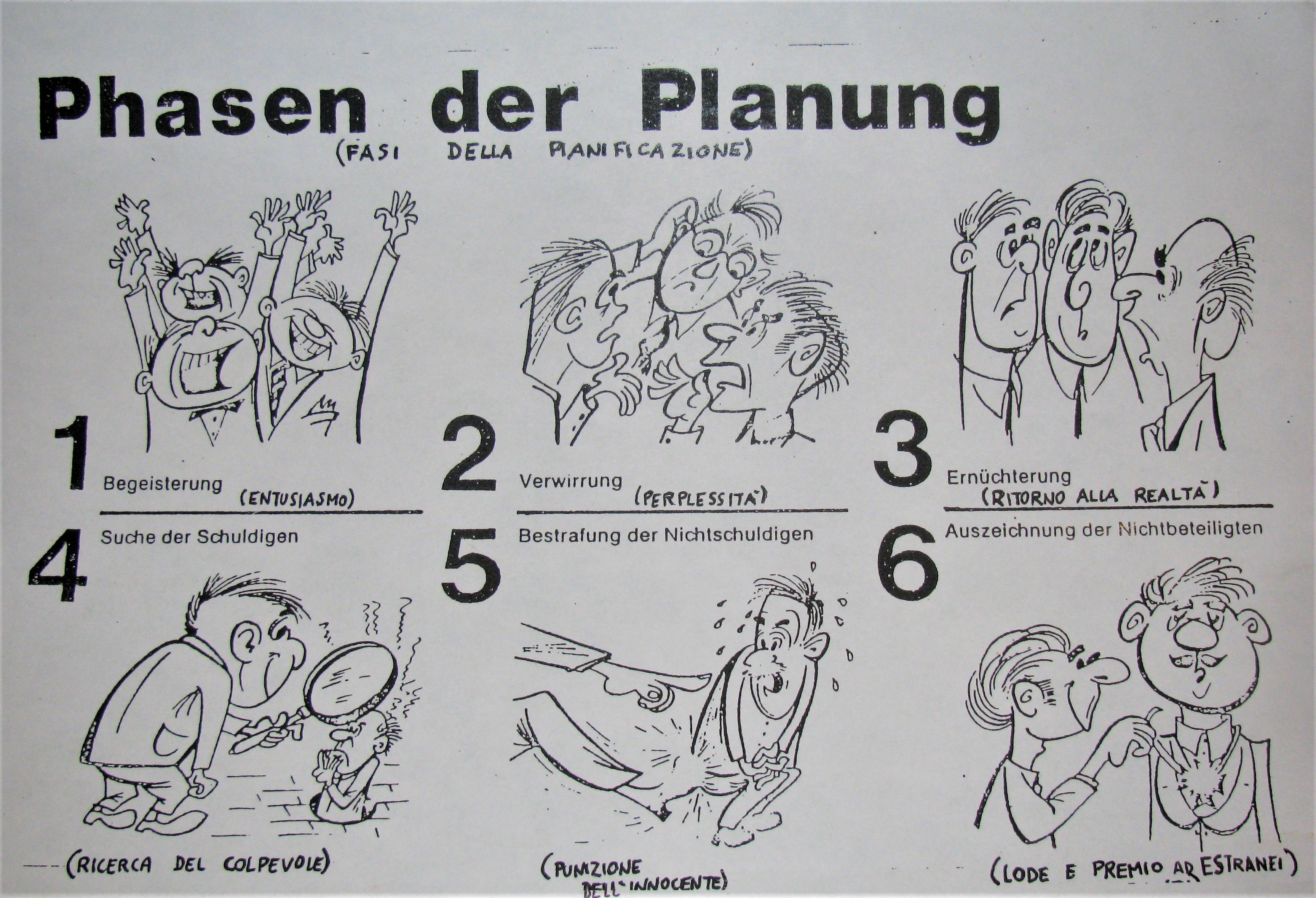 Questo è un relax-post. Ecchè? Mica si può essere sempre seriosi, mica si può! Ma … vi chiederete, come è andata? E’ andata così che io stavo mettendo in ordine la montagnola di carte che ogni giorno cresce sulla mia scrivania (metto qui queste carte, poi le guardo … tanto poi riordino … e invece …) quand’ecco mi è venuto fra le mani un foglio che mi era stato regalato dai miei collegi ingg. Siemens (!). E allora mi sono detto: lo fotografo e faccio una sorpresina alle mie lettrici ed ai miei lettori. Tutto qui. Spero che possa consolarci per tante nostre “talianade†… Cosa? Si leggono male le didascalie? Evvabbè … eccole qui le sei fasi che si svolgono in rigorosa successione: