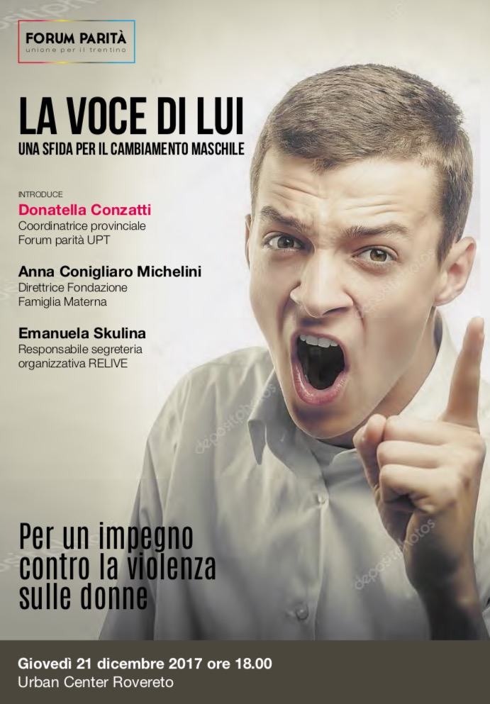 “La violenza sulle donne è un problema che parte dagli uomini e che solo gli uomini possono risolvere.  La conferenza promossa dal Forum Parità mira a fare una prima presentazione ed una valutazione delle iniziative in atto a quattro anni dall’entrata in vigore della Convenzione di Istanbul, che prevede la rieducazione dei maltrattanti quale parte integrante della strategia per il contrasto alla violenza di genere. Il nuovo punto di vista introdotto dalla Convenzione per affrontare il troppo diffuso problema della violenza – che si aggiunge al lavoro di sensibilizzazione dell’opinione pubblica e ai sostegni concreti a favore delle donne che hanno subito forme di violenza - è quello di una maggiore consapevolezza del maschile. E si traduce in interventi sui maltrattanti per la loro rieducazione e per evitarne l’impunità . Ma anche in un messaggio di cambiamento che parta dalla maggioranza degli uomini e rivolto agli uomini maltrattanti. L’Associazione Relive è la Rete nazionale dei Centri per autori di violenza. Centri che a diverso titolo operano nei confronti degli uomini autori di violenza sulle donne, sia gestendo servizi, sia svolgendo attività di promozione culturale sul tema della violenza maschile. Per il Trentino ne fanno parte, Fondazione Famiglia Materna e Associazione ALFID che esprimono le relatrici di questo inedito momento di confronto. La rete Relive si eÌ€ costituita nel 2014 ed eÌ€ stata accreditata dal Dipartimento per le Pari Opportunità al Tavolo di lavoro sul Piano d’azione nazionale straordinario contro la violenza sessuale e di genere. Inedita è la data della conferenza, volutamente non inserita nella settimana contro la violenza sulle donne ma in un periodo per molti luccicante e per alcuni sacro, perché ogni giorno le donne che soffrono e muoiono per “mano†altrui.