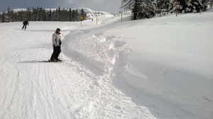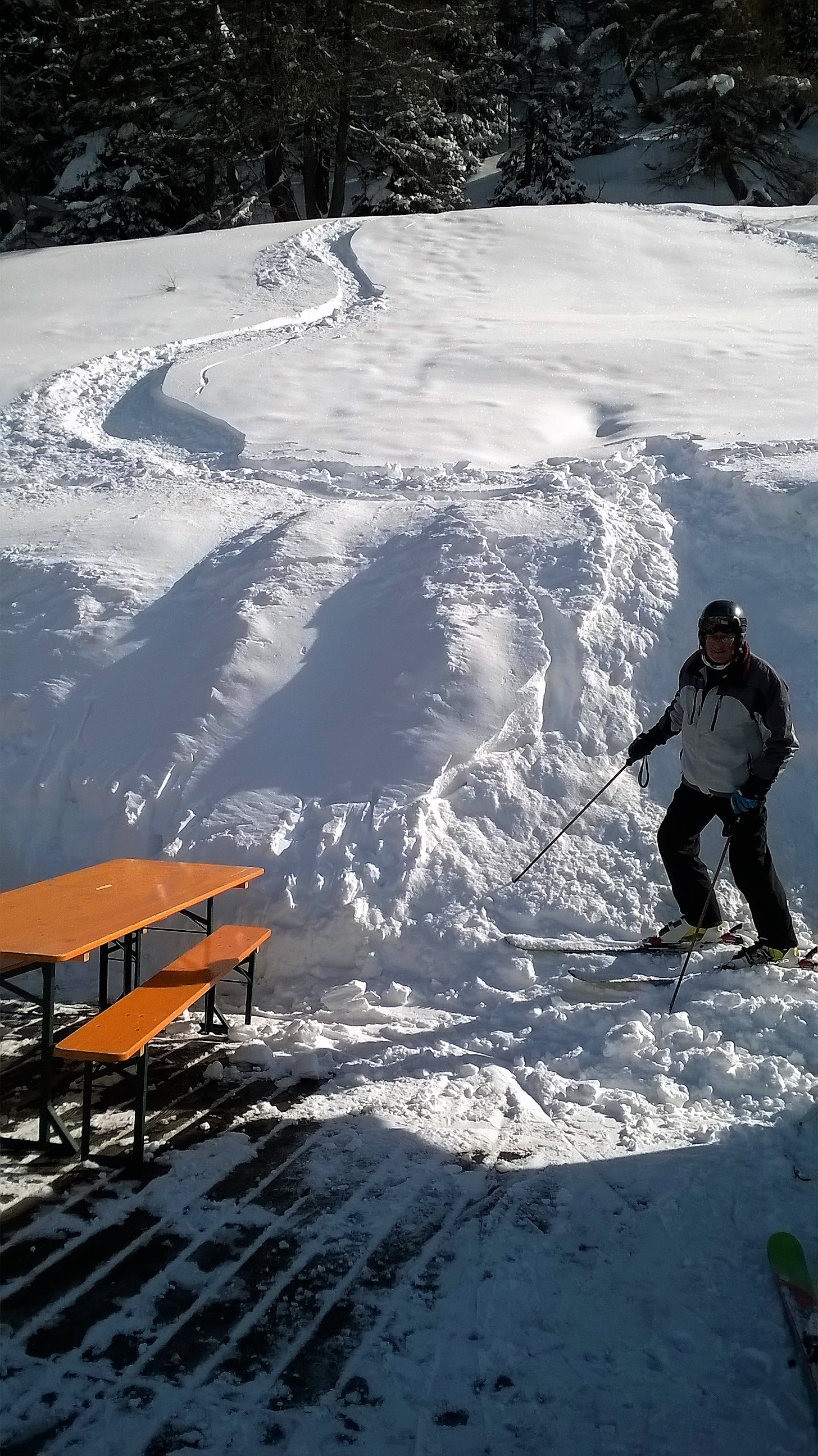 Da trent’anni abito anzi vivo benissimo e molto felicemente a Trento. Sveglia alle 07,00, viene un amico a prendermi alle 07,40, alle 08,30 prima funivia ad Andalo per salire in Paganella, prima sciata alle 08,45, rientro a casa per pranzo alle 13,15. Quale differenza abissale! (Qui a fianco, qualcuno ha lasciato una particolare traccia di “fuori pista”!)