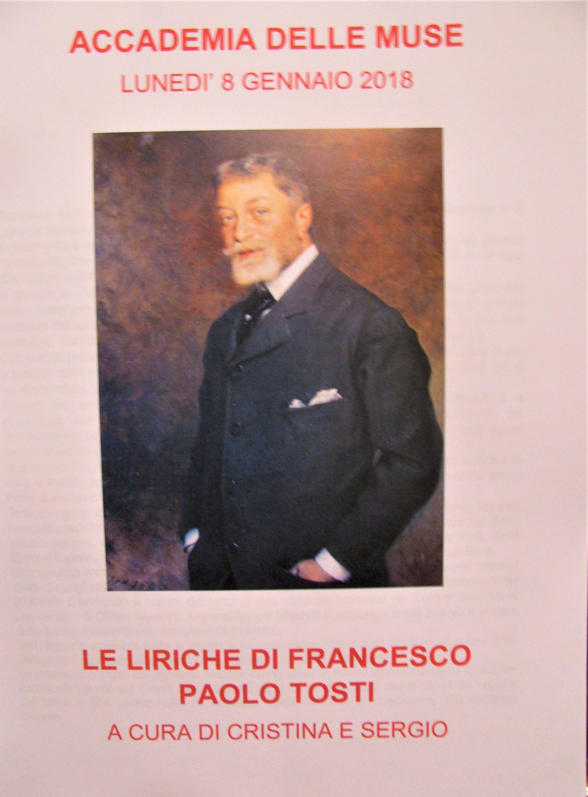 Ed allora mi sono detto: mettiamoci al lavoro. Ieri sera, prima parte, le liriche di Francesco Paolo Tosti (chi era costui? Maccome … se proprio non lo sapete, cfr. in internet … no …non è Francesco Totti, no … è tutt’altra cosa!) Voce Sergio Runchel, al pianoforte Cristina Endrizzi, voce narrante Giovanna Laudadio. Ecco i brani eseguiti: