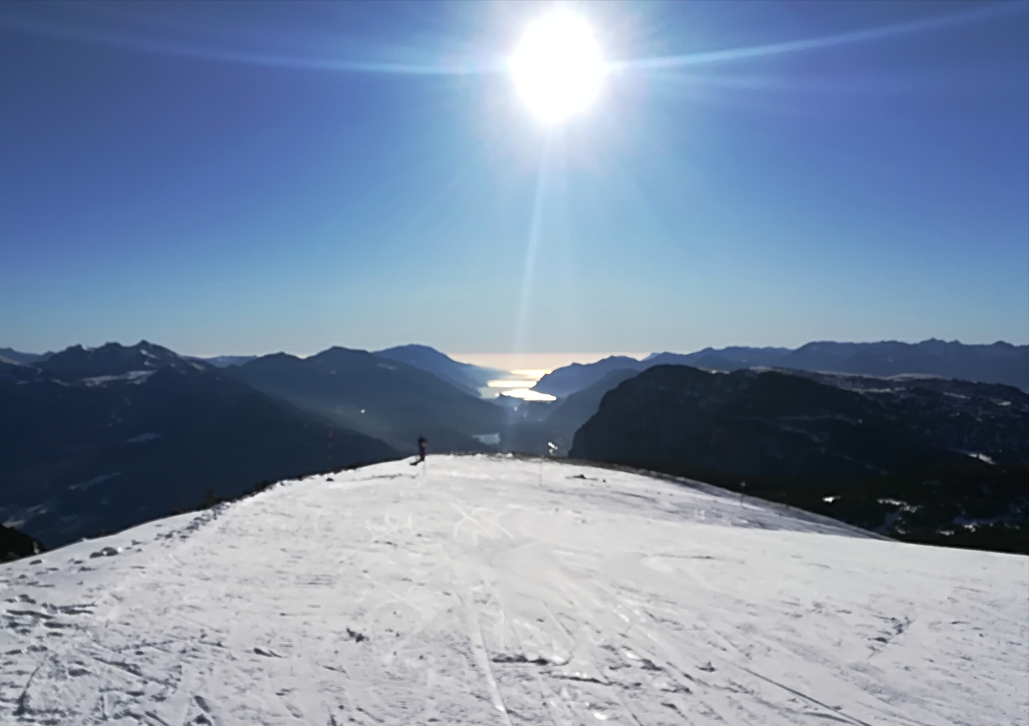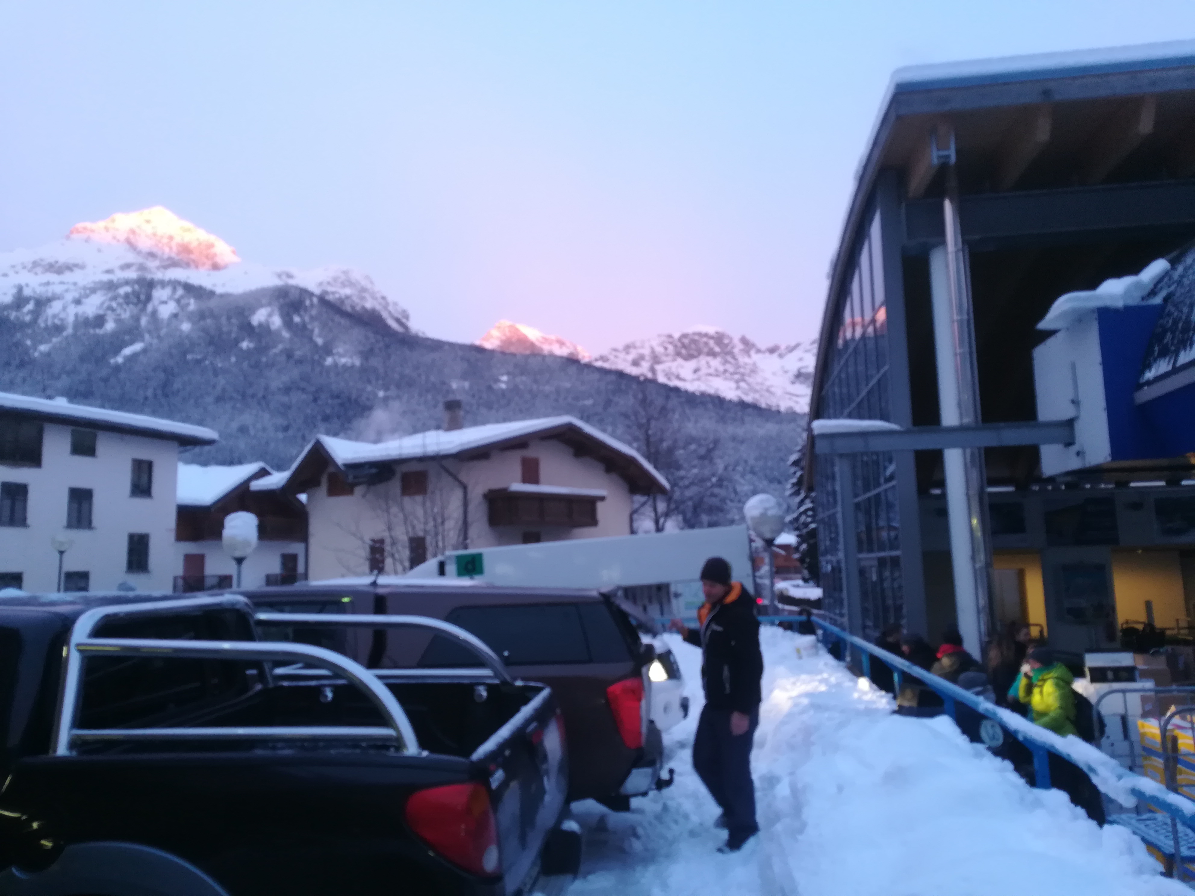 Moto: no, non motocicletta bensì movimento! Chi come me è un V.I.P. (=Vecchietto In Pensione) può andare a sciare in Paganella: prima salita ad ore 08,30 (ma conviene arrivare al girello alle 08,15 così siete sicuri si salire per primi!). Alle 08,45 siete a quota 2200, che vista putei, il sole che sorge libero e giocondo, il Lago di Garda, le Dolomiti del Brenta che se stendi fora un brazo te che tochi le so zime … dall’altra banda il Cimon de la Pala per chi lo sa riconoscere … e a nord la Val de Non, chiusa a nord dalle Maddalene che dietro c’è la Val d’Ultimo, lo savem ben noialtri. Uno spetacolo. Nella foto: è molto importante essere alla partenza della funivia quando ancora stanno caricando i rifornimenti per i rifugi in quota …