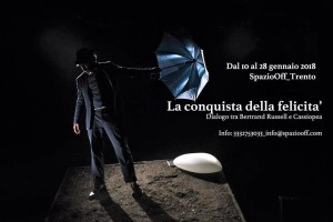 Quindi ci sono andato. Allo Spazio Off, Trento (v. in internet) ad una rappresentazione-conferenza (Michele Nardelli, Massimiliano Pilati, Forum Trentino della Pace e dei Diritti Umani) su “La conquista della felicità â€, dialogo fra Russel e Cassioepa. Russel, alias Stefano Pietro Detassis (che già avevo ascoltato in “Questa sera si recita a soggetto” di Pirandello al Teatro Sociale: bravo Stefano!); drammaturgia e regia: Maura Pettorruso; scene e costumi: Maria Paola Di Francesco; disegno e luci: Alice Colla; organizzazione: Daniele Filosi. 50 spettatori a riempire la piccola sala.