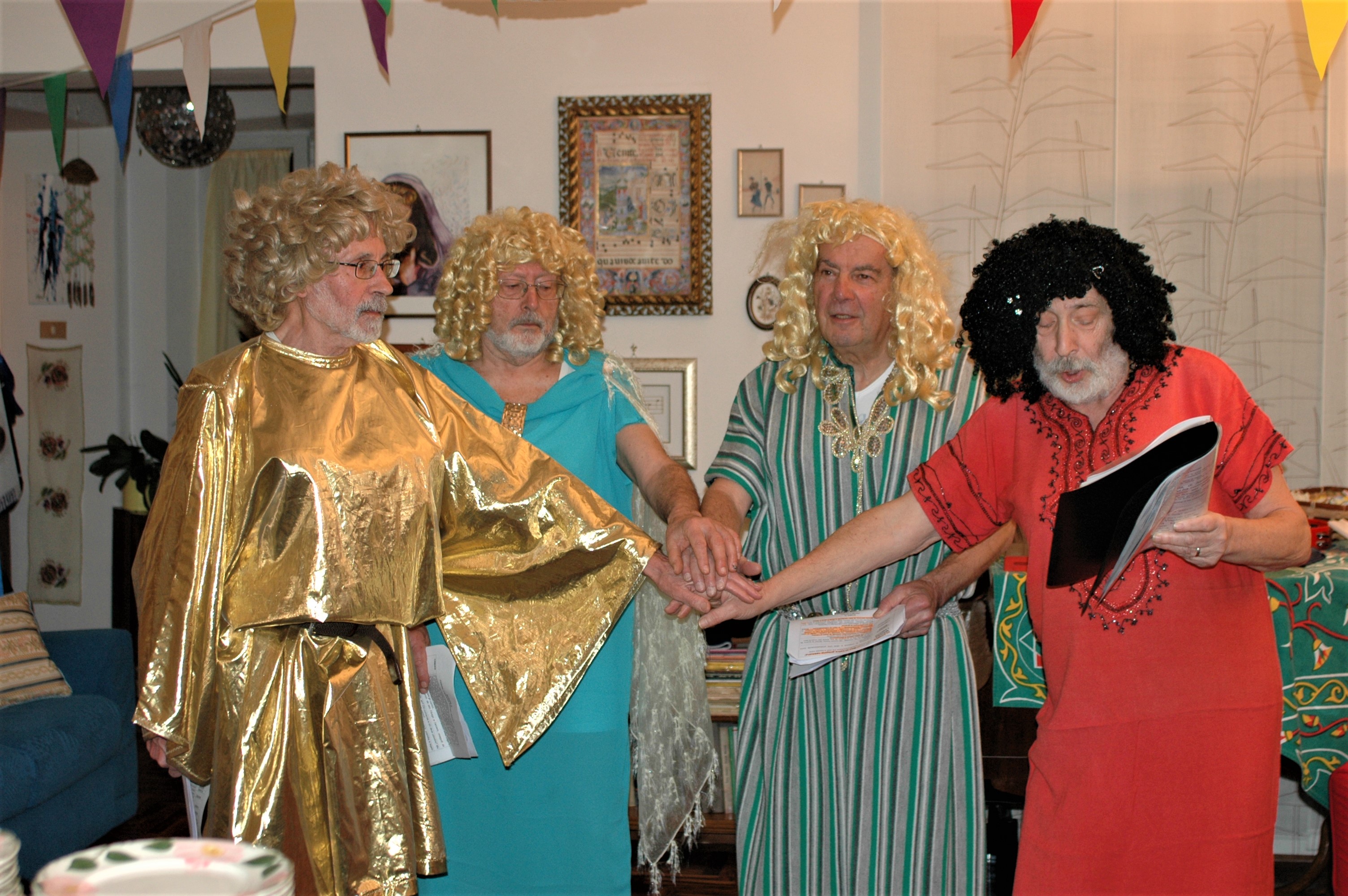 Lisistrata (in rosso) fa giurare (da sinistra)  a Lampitò, Mirrina e Cleonice l’impegno a scioperare