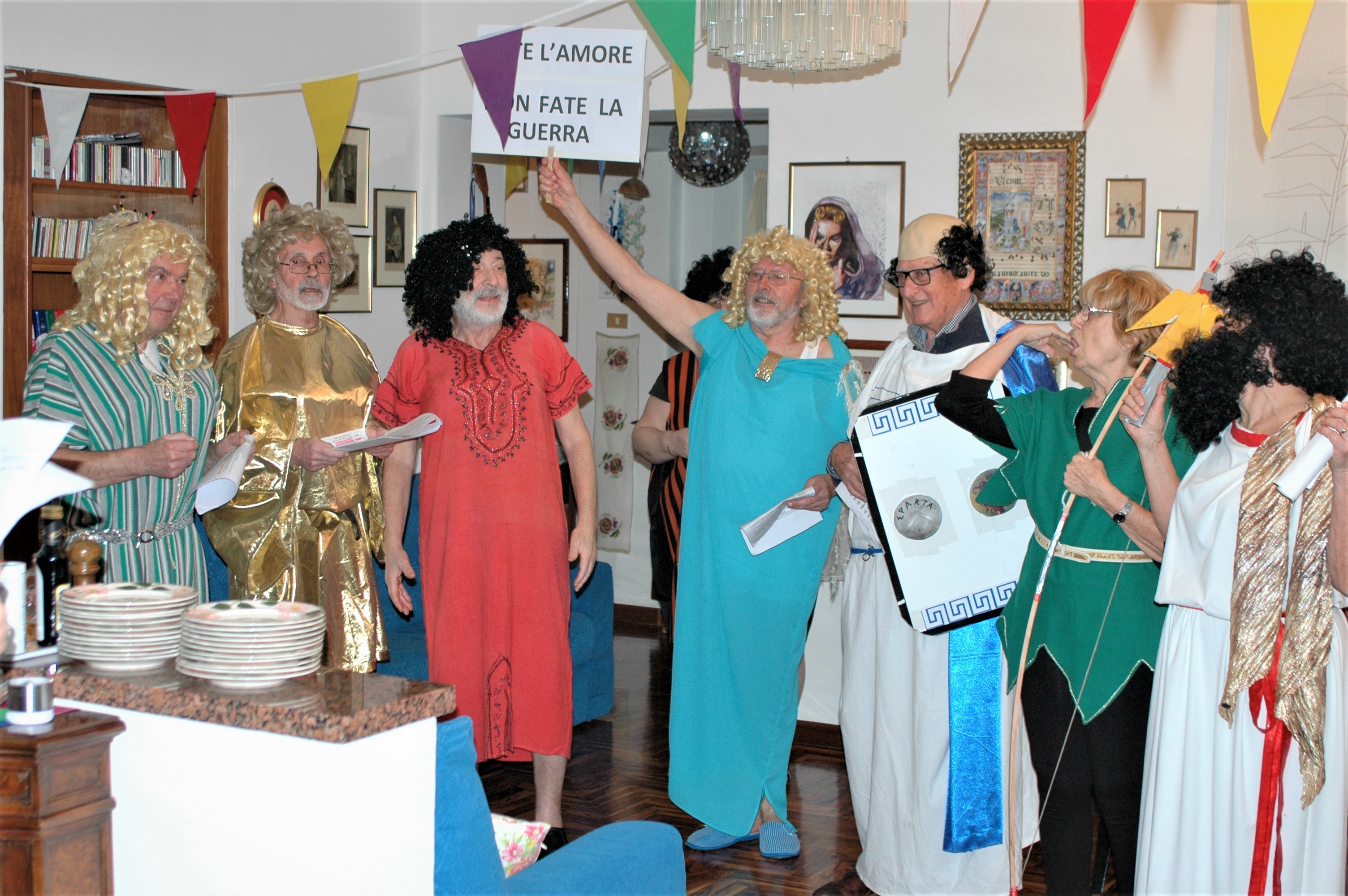 E’ seguito il consueto angolo delle anteprime, con l’annuncio degli eventi che trovate inseriti nel post agenda o scadenziere che dir si voglia. E poi … poi mentre il “pubblico†si deliziava e stappava bollicine per il consueto intervallo eno-astronomico (!) gli Attori della Compagnia dei Guitti si sono ritirati nei loro camerini per indossare i costumi della commedia “Bel colpo Lisistrata†secondo il copione liberamente tratto da Maria Teresa dalla Lisistrata (lisis-statos, colei che liquida gli eserciti) di Aristofane (411 a. C.). Durante la Guerra del Peloponneso le donne vogliono entrare in politica (l’attualità !) per far cessare la politica dei signori uomini cioè la guerra (l’attualità !). Per ottenere ciò bloccano l’accesso al tesoro della Lega che veniva utilizzato per l’acquisto delle armi e proclamano lo sciopero del sesso fino a convincere gli uomini a deporre le armi.