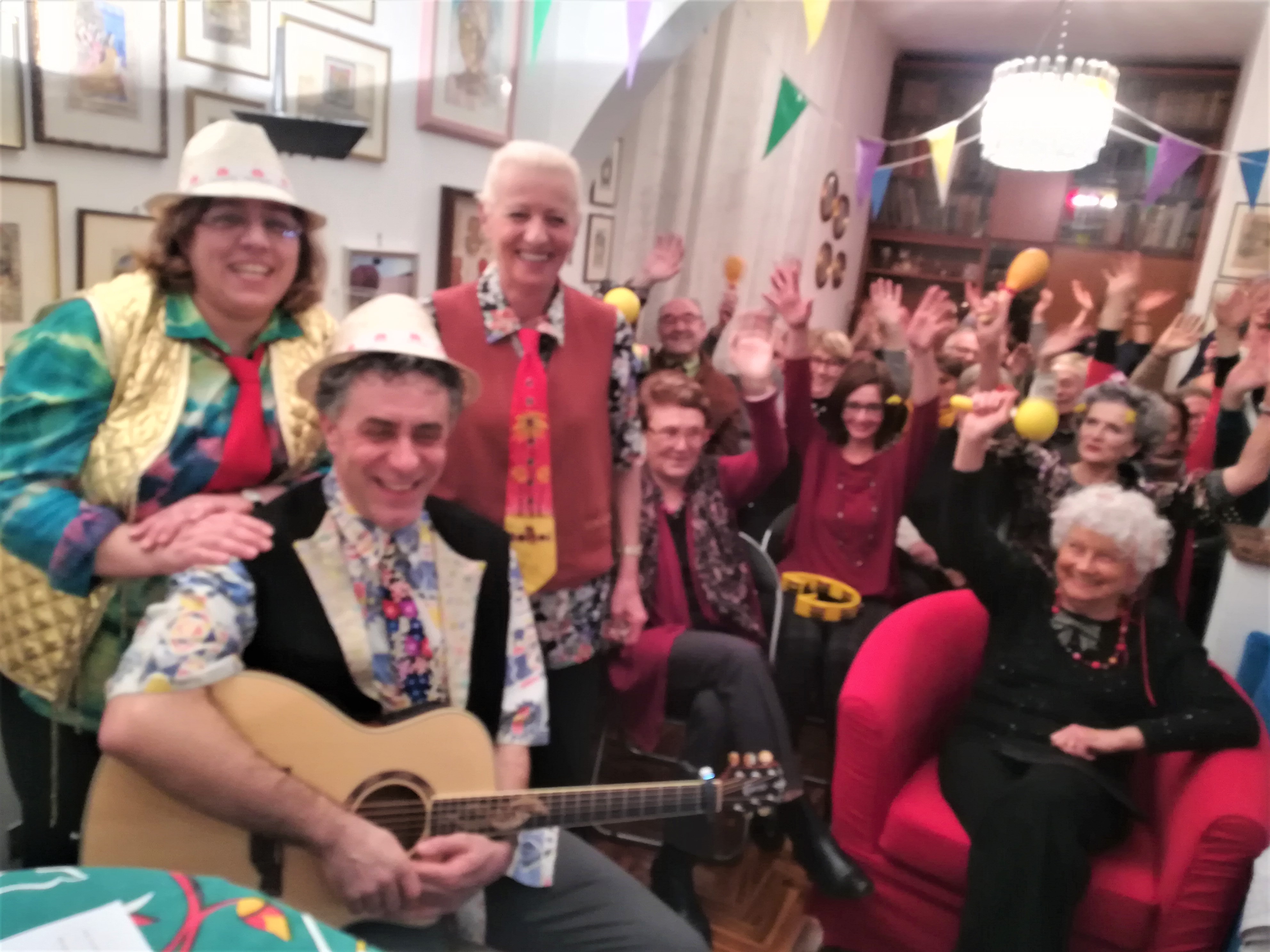 Raga, ieri sera ci siamo superati! Tanto … chi siamo lo potete leggere nei molto post sulla nostra Associazione, la quale è molto, molto attiva ormai da dieci anni! Ieri sera, prima parte della serata, alcune delle più popolari canzoni di Renzo Arbore. Preceduti dalla lettura del suo fa-vo-lo-so curriculum artistico, Cristina (pianoforte), Giovanna (voce) e Patrik (chitarra e voce) hanno eseguito: Si la vita è tutto un quiz; Ma la notte no; Il Materasso; Sfigato mambo; Grazie dei fiori bis; Il clarinetto; Cacao meravigliao , canzoni tutte accompagnate dal coro del pubblico che ha intonato i relativi ritornelli e segnato il ritmo con tamburelli e maracas.  Il Clarinetto, dedicato allusivamente, al compleanno di uno di noi; con i fiori bis poi Giovanna ha cantato lanciando fiori al pubblico! Al ritmo di Cacao infine ballo spontaneo di mamma Anna , a festeggiare il suo 95° compleanno! Auguri e complimenti, Anna!