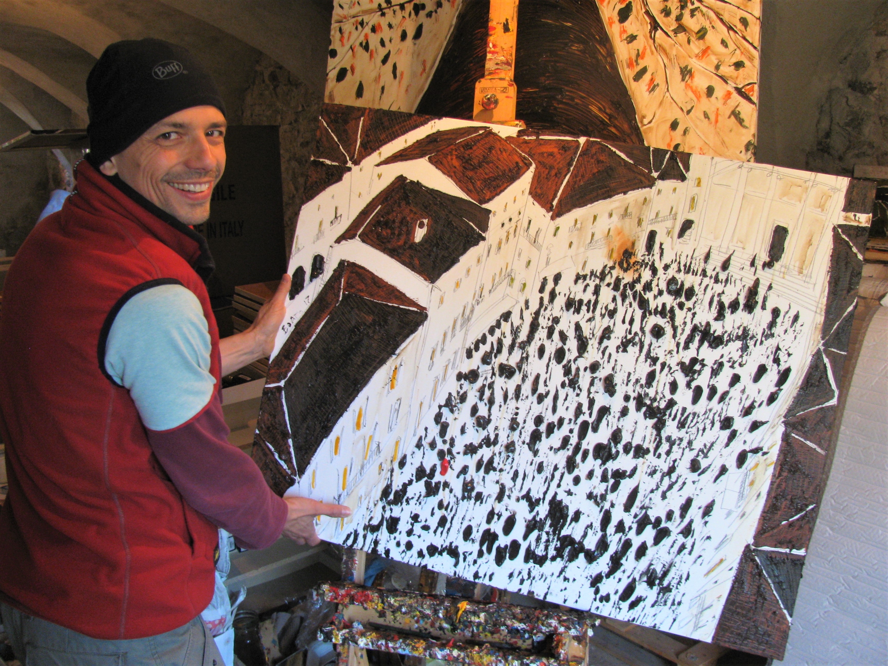Marzo 2017: al Muse, nell’ambito dell’evento “La voce della piazzaâ€, l’amica Accademica Nadia Ioriatti legge alcuni brani dei suoi libri “Io tinta di aria†e “Aria che allenta i nodi†in uno spazio addobbato come piazza dai quadri di Matteo Boato. Riccardo ne trae un post, indi sale a Gabbiolo ad intervistare il pittore, ne nasce un secondo post e Matteo è invitato a diventare dei nostri. Matteo, non solo pittore. Infatti il “ragazzoâ€, classe 1971, ne ha fatto di cose! Diplomato in chitarra classica, ne è stato insegnante; è stato Ufficiale di complemento; è ingegnere civile; ora è pittore. Ha due figlie di 12 e 10 anni, Matilda e Beatrice, due nomi, musicale l’uno (Matilde ricorda “Mateldaâ€, un capolavoro-calypso di Harry Belafonte); poetico l’altro (Beatrice, la Beatrice di Dante): figlie appassionate di Pittura, Musica e Danza. Matteo racconta: “Papà architetto veneziano. Io ho il ricordo di tutto ciò che di bello mio papà mi insegnò a vedere, non solo a guardare. La laurea (“la chitarra va bene ma se fai l’ingegnere troverai facilmente lavoroâ€); il servizio militare; il lavoro (anche nel gruppo Stet, Telecom e Sodalia). Poi a 28 anni, il colpo di fulmine: in tre giorni ho deciso che dovevo fare ciò che mi sentivo di fare: ed era la pittura. Così mi comandava lo stomaco, più che il cervelloâ€. Benvenuto fra di noi, Matteo! Ed ora sulla tua pittura, qualche parola di presentazione da parte del tuo collega pittore, già prof universitario di fisica, Giovanni Soncini.