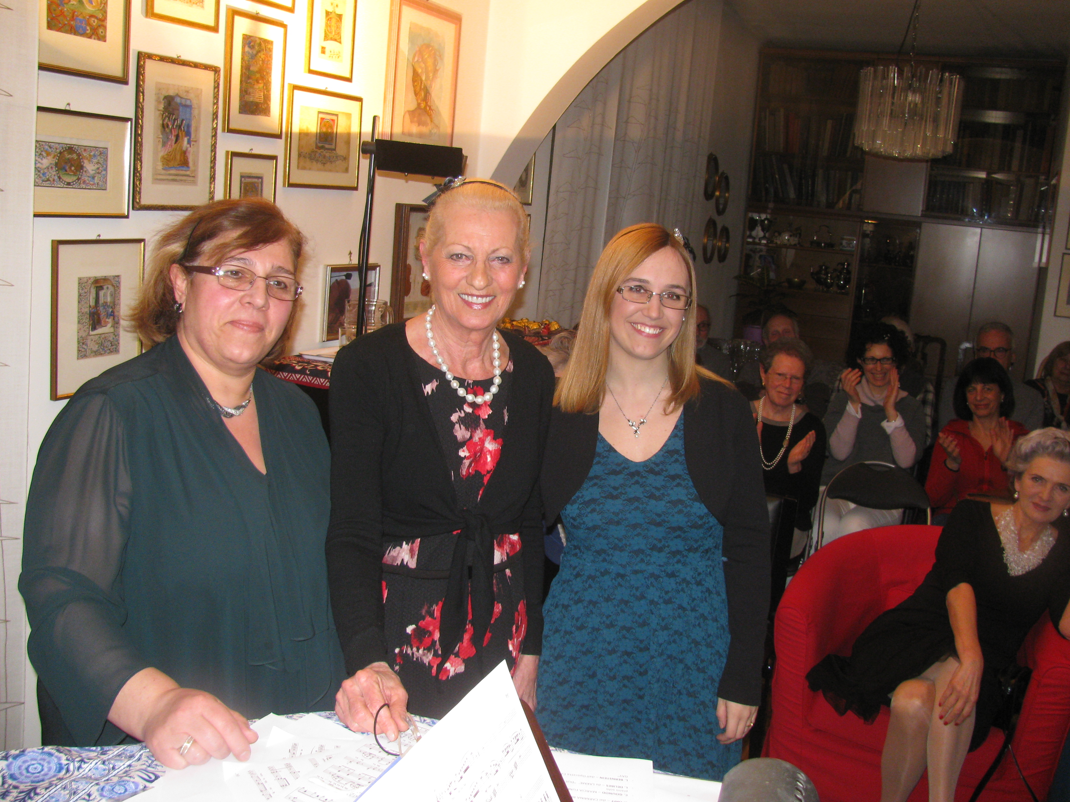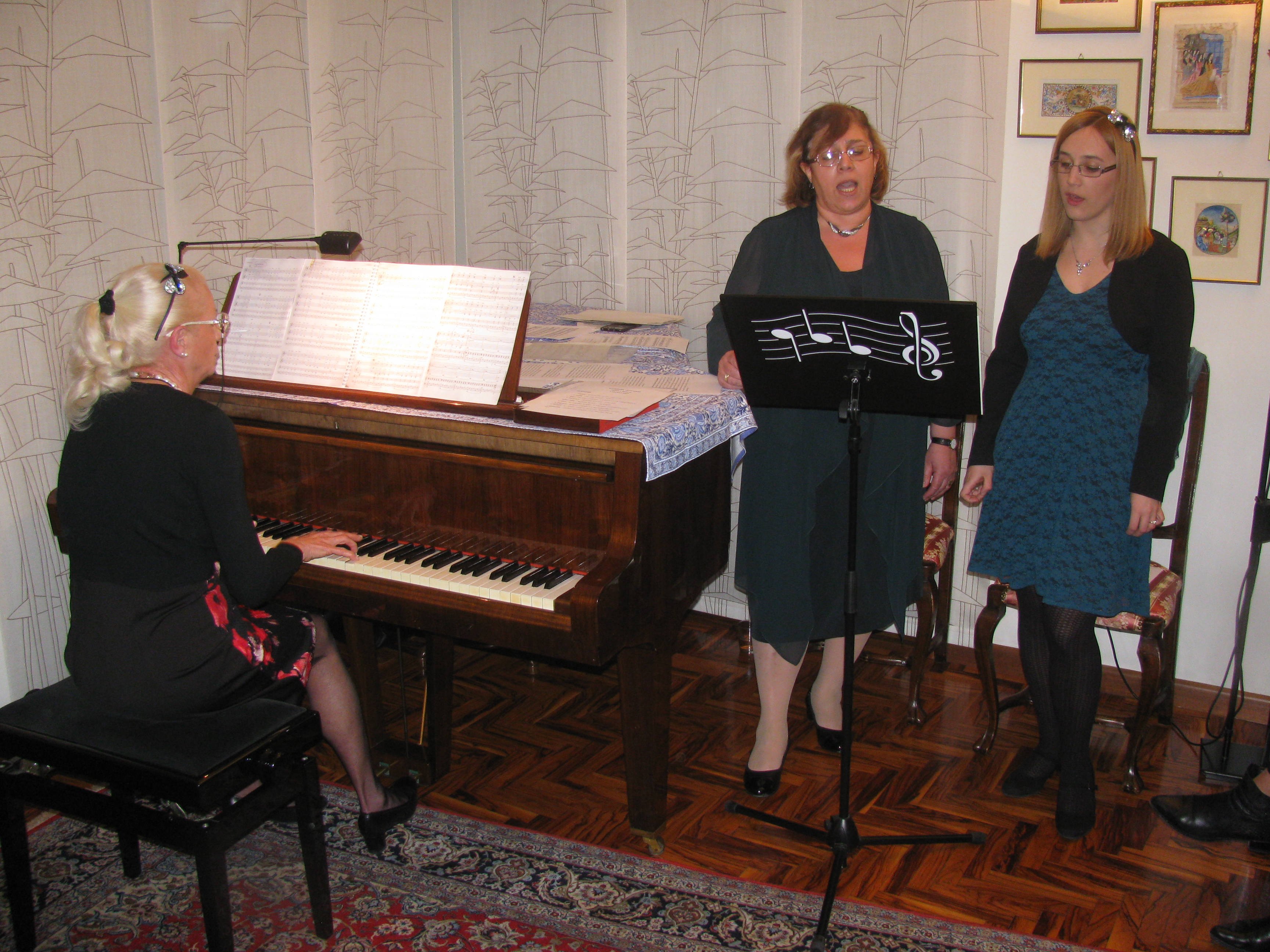 Erano, e sono, un gruppetto di soci fondatori che dieci anni fa hanno dato origine ad un Circolo Culturale Privato, l’Accademia delle Muse,  nel quale si entra per amicizia-passa-parola, senza alcuna formalità . Il nucleo originario di una quindicina di persone oggi consta di circa cento Accademici, frequentanti nella misura media del 45% e attivi in quella del 20%. Non male. Ci riuniamo una volta al mese da ottobre a giugno presso la casa della Presidente Cristina (grazie, Presidente!) e in ogni serata trattiamo tre argomenti: il primo – la cena (!) – il terzo. Nel senso che ognuno offre ai colleghi ed amici l’arte sua: musica, canto, storia, fotografia, poesia, pittura, viaggi, sport, teatro, letteratura, giornalismo, etc.. Questa sera (poco fa!) è stata la volta di “Chicche musicali: musica a sorpresaâ€, nel senso che il trio Cristina Endrizzi (pianoforte) Letizia Grassi e Giovanna Laudadio (voci) ci hanno offerto alcune splendide perle musicali: