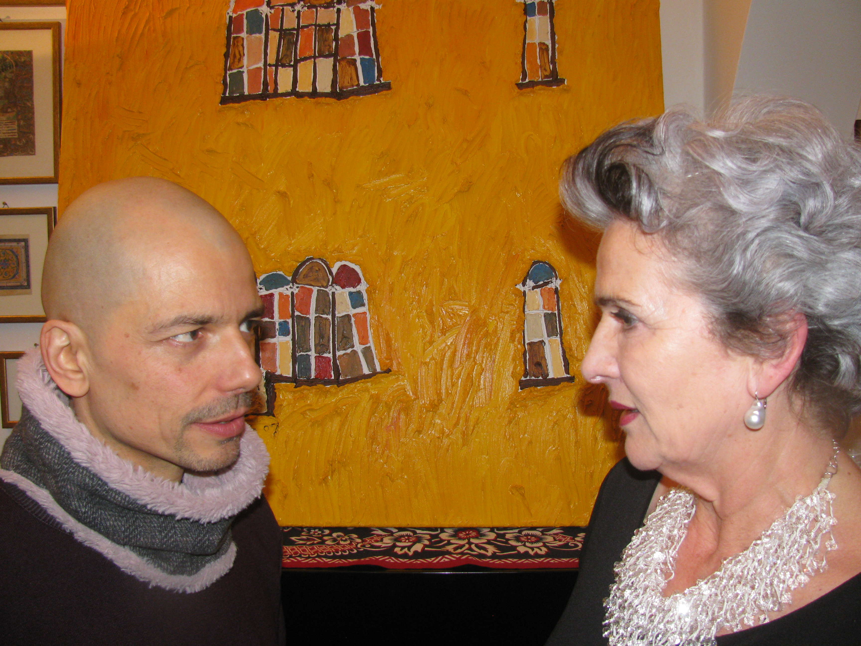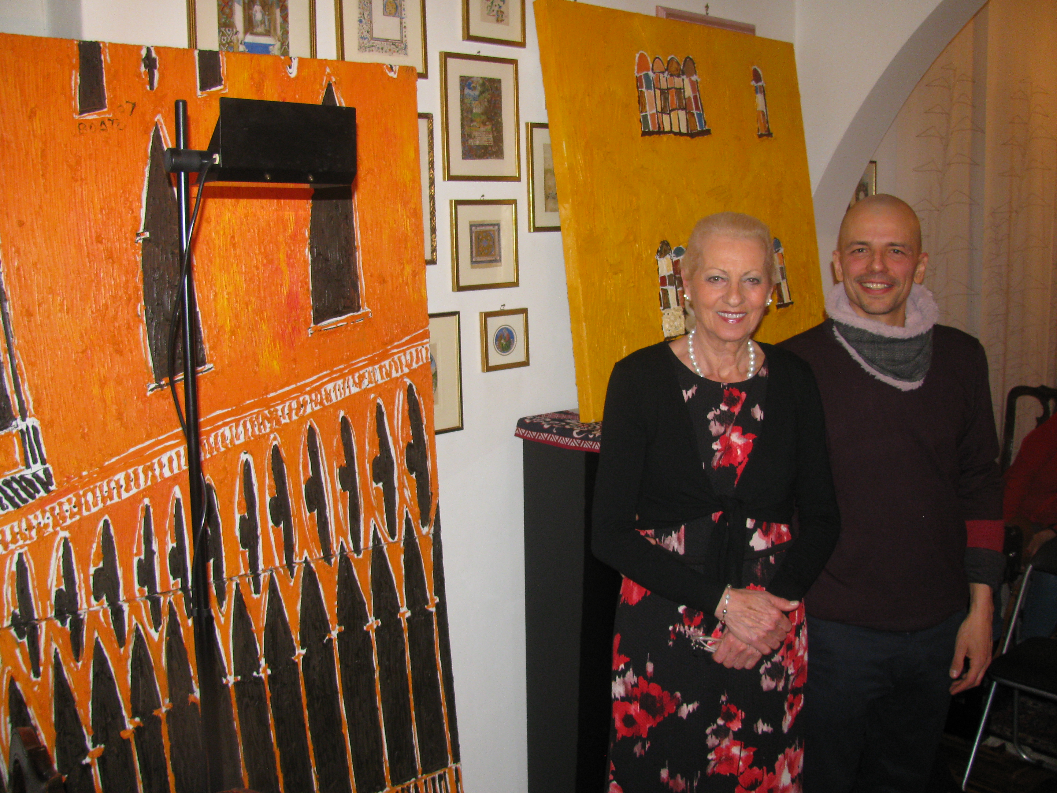 Matteo, artista affermato in campo internazionale. Le serie di dipinti “Palazzi”,  “Piazze”, “Mani”, “Archi”, “Paesi” … con ombre che sono materia e materie ombra; prospettive piane che sposano visioni tridimensionali; realtà immaginate “dall’alto”, colori “scolpiti” su tele che sembrano pareti di marmo … una nuova “Fantasia” disneyana, visto che Matteo, musicista, sposa note a colori e colori a note.   Successo pieno della sua esposizione, accompagnata da diapositive e filmati con colonna musicale di due musicisti famosi: Matteo e Bach. Bravo, anzi, bravissimo Matteo! La proiezione è stata ricca e è durata molto: nessuno si è alzato, nessuno si è stancato: tutti siamo stati rapiti dal regalo che ci stavi facendo. E poi, Matteo, grazie anche per i regali dei tuoi preziosi cataloghi e di tre splendide xerografie!