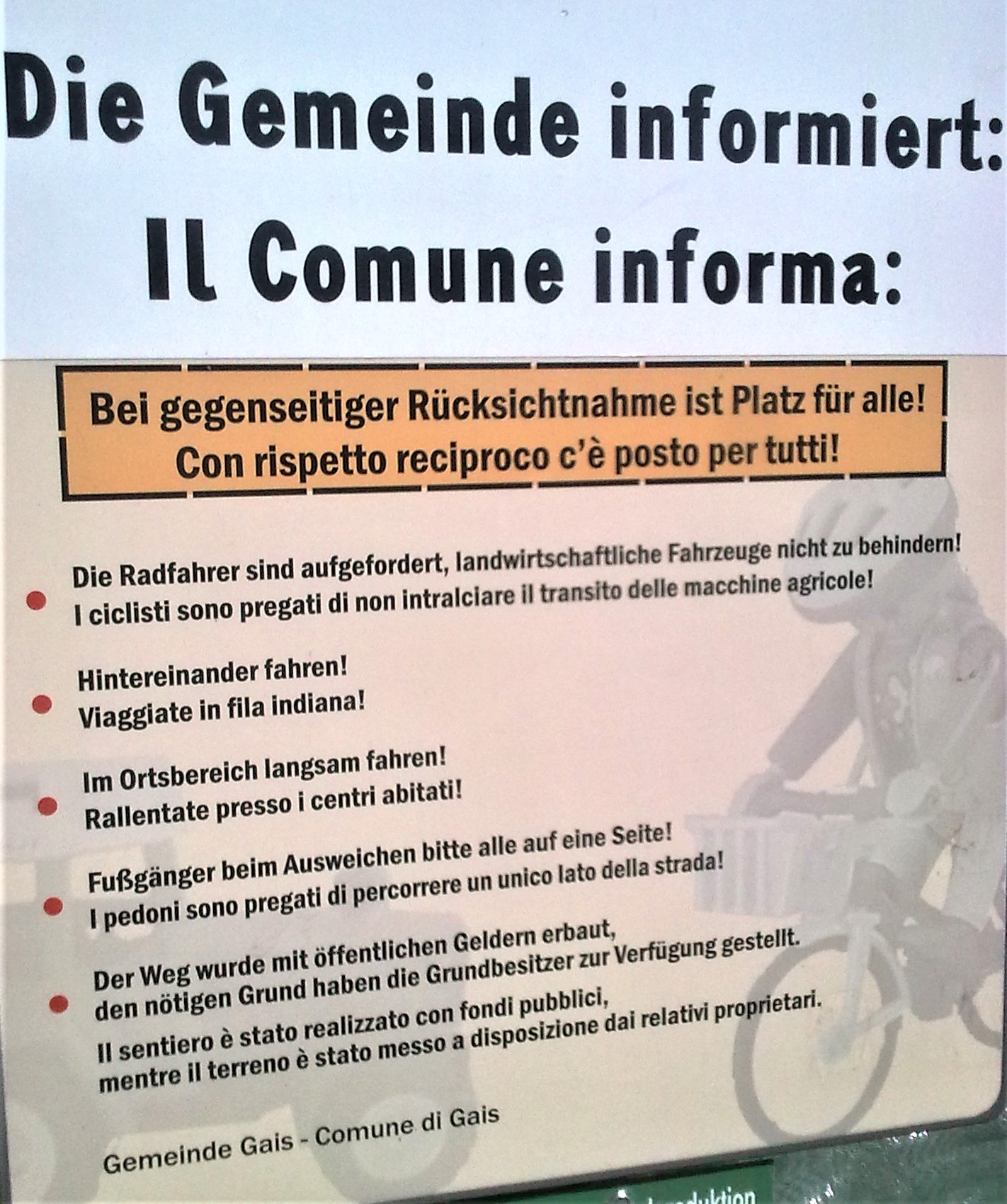 Sud Tirolo. Un cartello del genere è da anni apposto all’inizio della pista ciclabile della Valle Aurina: in due lingue invita ciclisti e pedoni a rispettarsi a vicenda, ed entrambi a non ostacolare il transito dei mezzi agricoli: infatti avverte che la pista è stata realizzata dal Comune su aree dei contadini. In un tratto della ciclabile bolzanina dell’Adige aperta anche alle auto, un cartello: “Velocità massima, 30kmh, escluse le bicicletteâ€: quasi una barzelletta, questo!