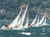 Fronte freddo dopo una ampia perturbazione estiva (situazione molto rara): cielo tipico da coda della perturbazione, azzurrissimo con nuvole bianche luminosissime. Lago splendente di argento piombo accecante. Caratteristica del vento: raffiche non solo sotto la costa Nord ma anche verso il centro-sud del lago con salti di direzione notevoli. Cosa fare? Ammainate lo spinnaker ed impugnate una buona macchina fotografica!