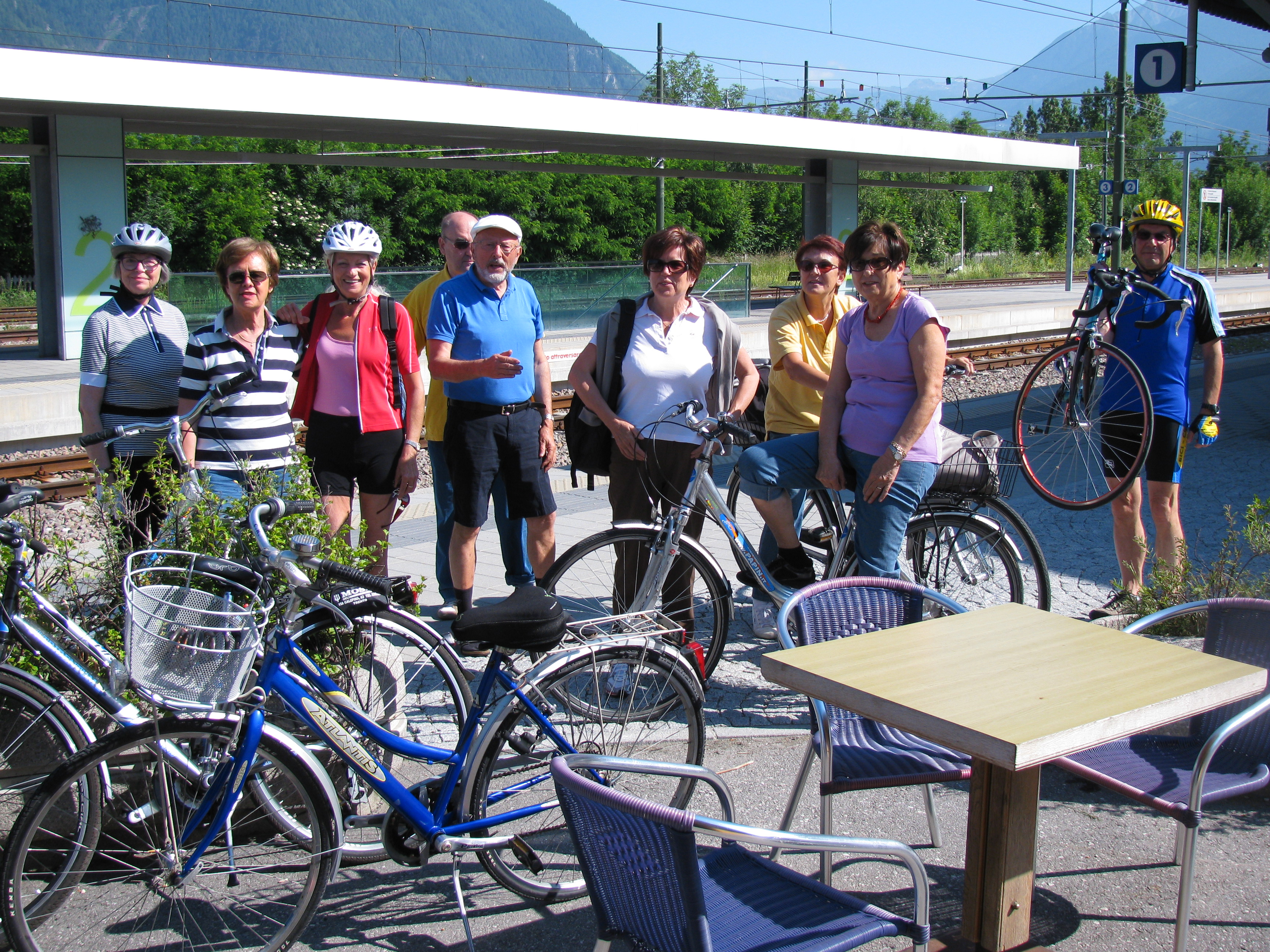Eravamo in dieci, su tre auto. A Brunico Stazione FS, ampio posteggio auto e noleggio bici, €16,00 al giorno (per chi non se la era portata appresso). Piccolo bar. I WC sono “in fondo a destraâ€, seguendo il marciapiede ferroviario verso nord est, direzione Dobbiaco, ci sono, credete a me, anche se li vedete solo all’ultimo momento!). Indi con le bici si prende l’ascensore in stazione (che lusso!) che ci porta in bassio, al piano strada e via, a destra, verso la Valle Aurina!