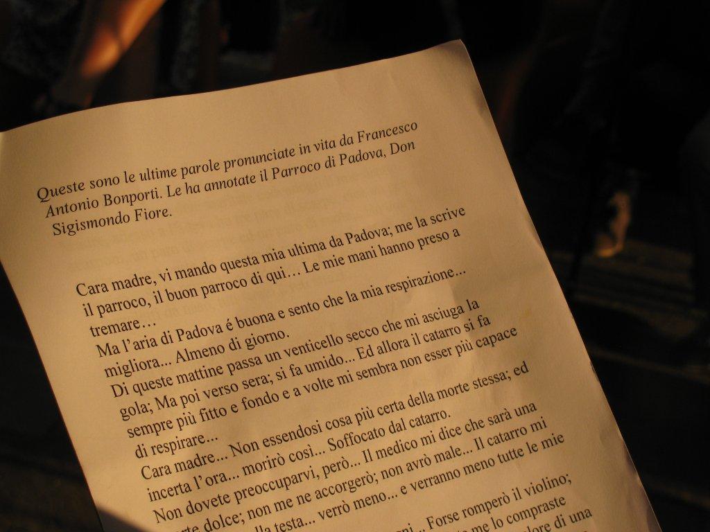 Ci siamo riuniti. Di Bonporti è stata data lettura di un “falso†quanto alla forma, al documento, ma non certo quanto ai contenuti, cioè di una lettera che Bonporti (non) avrebbe scritto alla madre, la quale tuttavia riepiloga le fasi salienti della sua vita, le sue aspirazioni e le sue delusioni.
