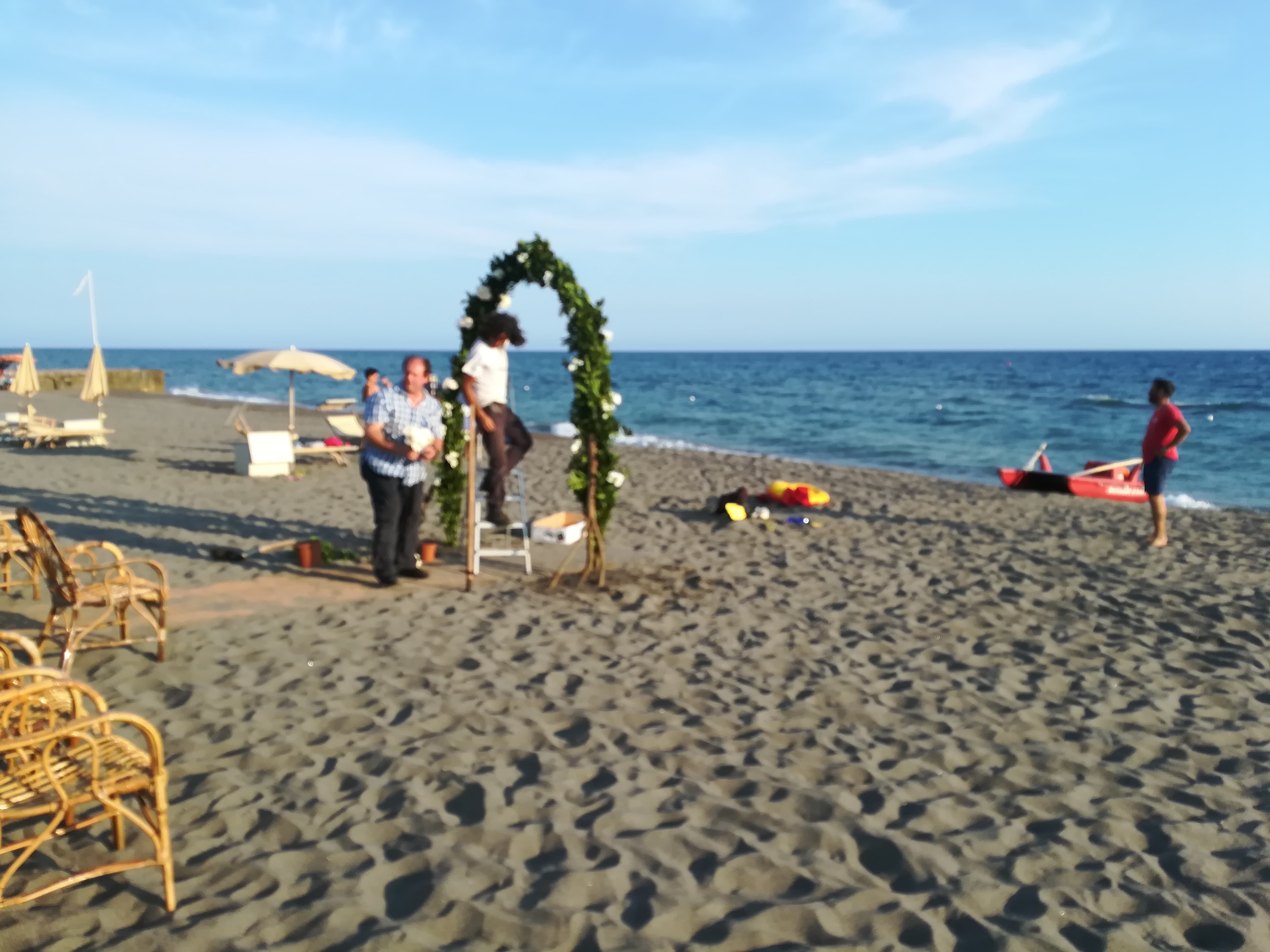 Una spiaggia. Si sta allestendo la celebrazione di un matrimonio. A pochi metri, una barca di salvataggio …