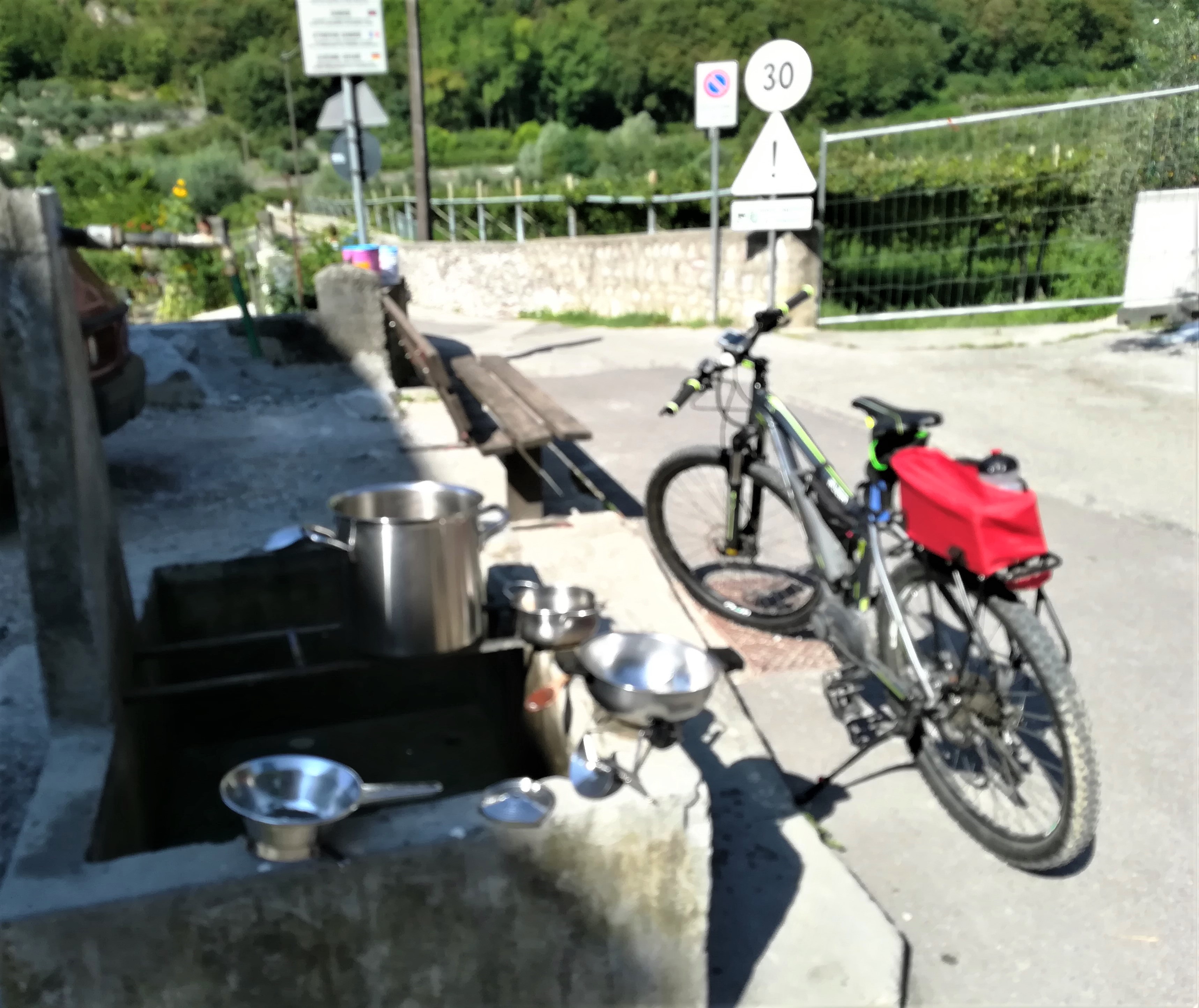 Ceniga (TN), conosciuta per il ponte romano che poi romano non è ma tant’è … Poco prima del pluri-fotografato ponte, per chi viene da nord, una fontana: oggi con gli attrezzi per fare la salsa di pomodoro alla vecchia maniera, con il passa-pomodori a mano. Sposto un poco la pentola, riempio la mia borraccia e apprezzo il “sentire e sentirsi†di quelle persone: la “cosa pubblica†è anche loro e giustamente la vivono.