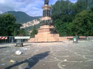 Sta di fatto che, uscendo io alle 07,00 del giorno dopo, e recandomi in bicicletta in Piazza Dante per incontrarmi con altri “normali†per una bella pedalata sino a Riva del Garda, ho dovuto schivare cartelli stradali divelti, moltissimi cocci di ceramica, moltissimi pericolosi frammenti di vetro, mucchi di spazzatura, etc.. Uno spettacolo da terzo mondo. Ma poi puliscono sa, mi si dice .. Si, e ci mancherebbe altro! Solo che il problema non dovrebbe essere quello di “pulire†ma quello di “non sporcareâ€. Sono stato giovane anch’io, ma l’impulso di spaccare le bottiglie vuote per terra, di divellere segnali stradali, di attaccare briga con ubriaconi non l’ho mai avvertito.