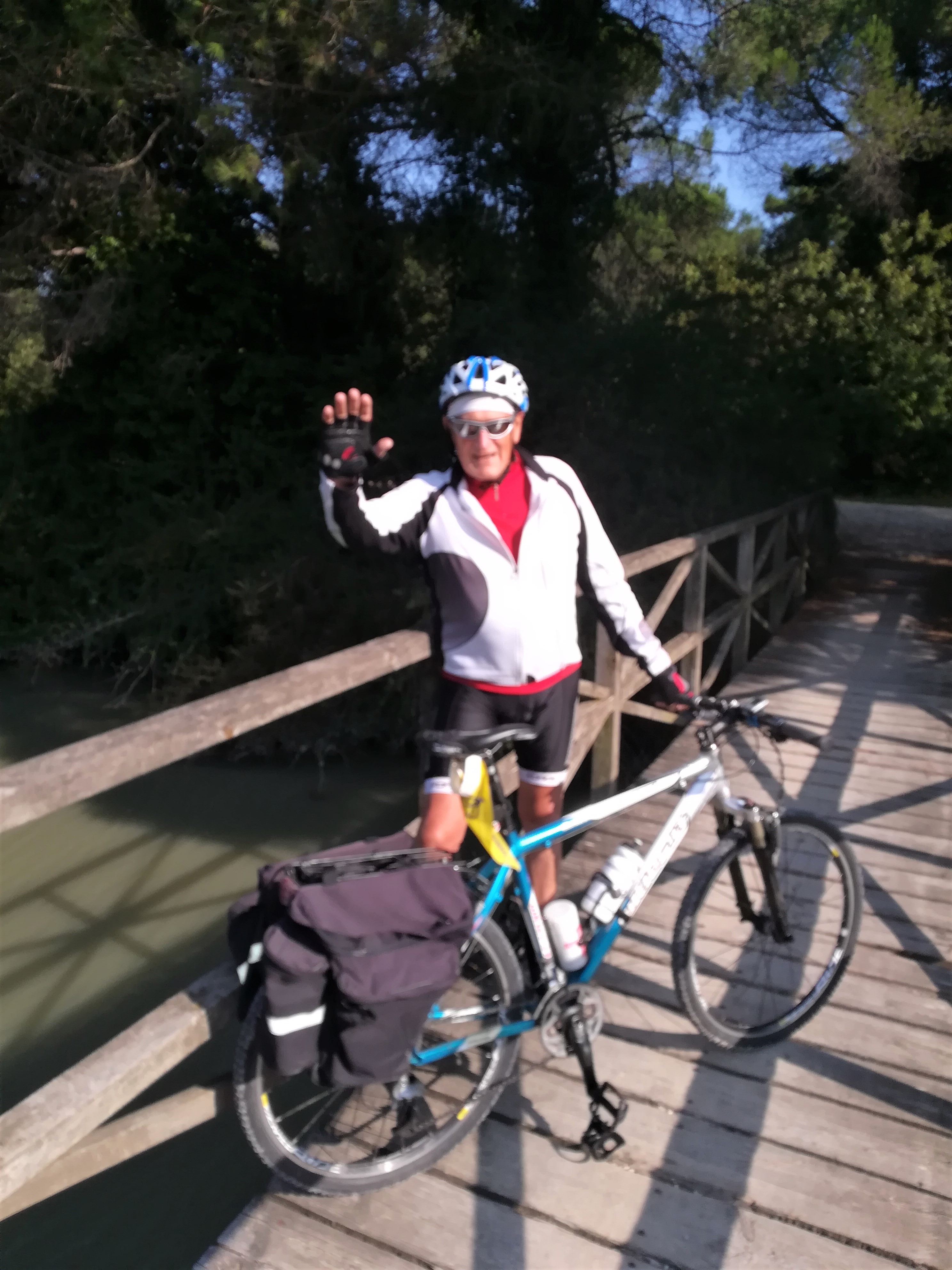 Ogni anno sono (anche) da queste parti. E la prima pedalata (in pineta e per strade poderali) è quella da Milano Marittima alla Basilica. “Vai da solo?” mi chiede mia moglie. “Si, i primi cinque minuti …”. Infatti la bici unisce, nel senso che si fa presto a scambiare una parola anche due e oggi ne ho scambiate ben oltre: quattro! Innanzi tutto con chi gentilmente mi ha scattato la foto qui, sul ponte ciclabile.