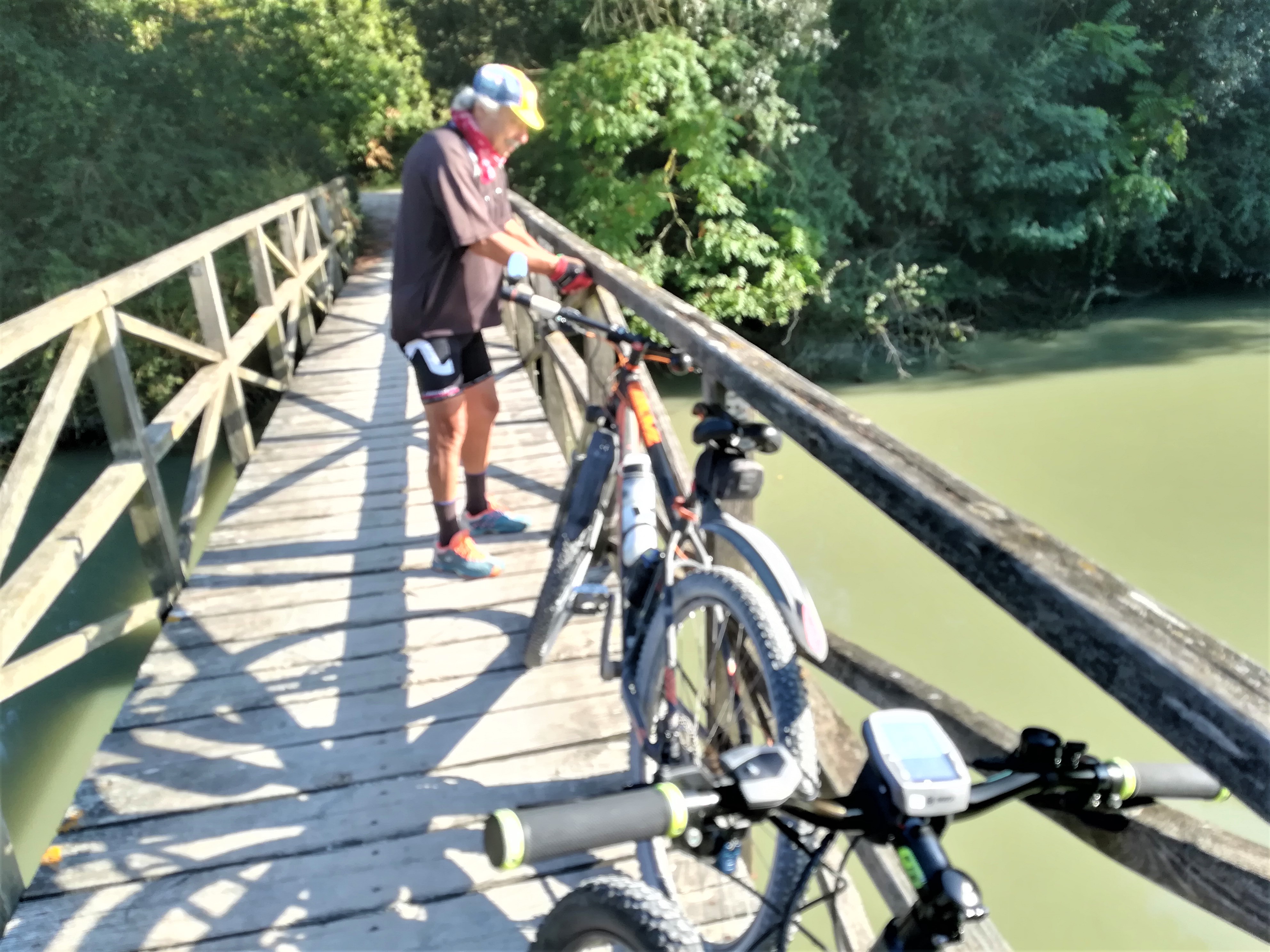 Tanto per cominciare, arrivati sul ponte sul fiume Fosso Ghiaia, vedo Antonio incidere una tacca di legno sulla balaustra: “Sai … è la nostra statistica del passaggio sul ponte: queste sono le mie, là a sinistra quelle dei miei amici”. Proseguiamo.