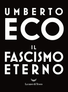 Il mio prossimo post? Su un libro, anzi su un saggio di tale Eco dr. Umberto, “Il fascismo eterno”, La nave di Teseo Ed., prima edizione in Cinque scritti morali 1997; prima edizione La nave di Teseo 2018, €5,00. Si tratta di 44 paginette scritte molto larghe ma di enorme peso specifico. Si tratta dell’opera di Eco più venduta in assoluto, più del Nome della Rosa, recentemente citata dal giornalista Aldo Cazzullo su Corsera del 5 settembre 2018 pag. 27, sotto il titolo “La fine del parlamento e il fascismo eterno”.