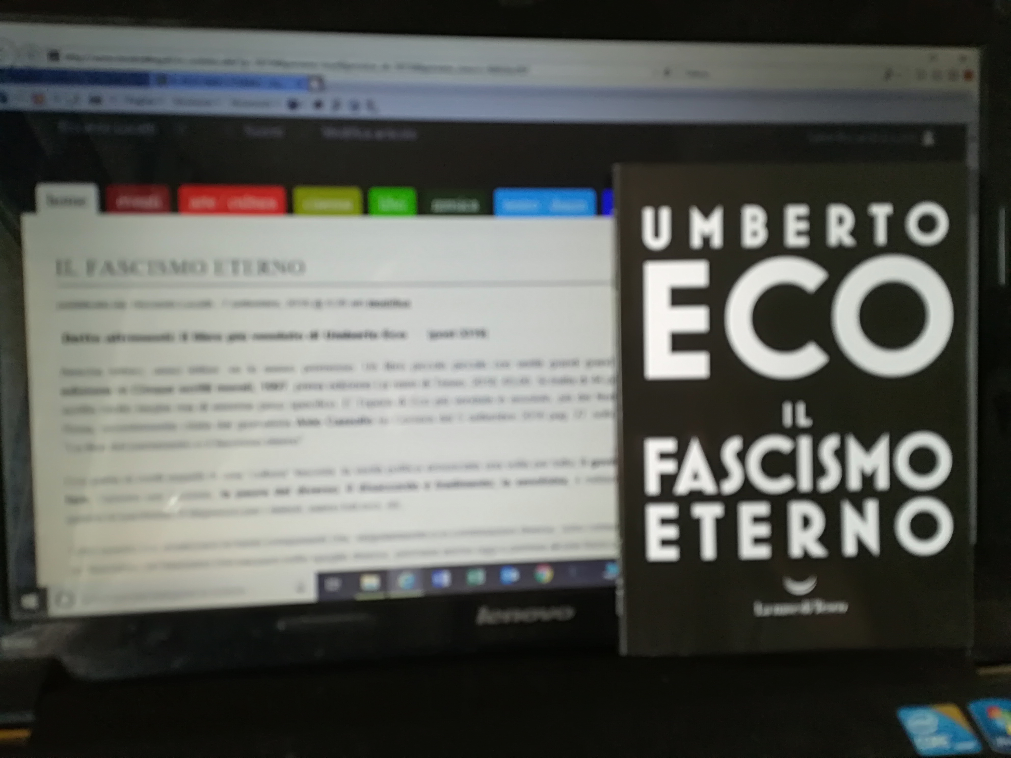 Amiche lettrici, amici lettori: ve lo avevo promesso. Un libro piccolo piccolo con verità grandi grandi: prima edizione in Cinque scritti morali, 1997; prima edizione La nave di Teseo, 2018, €5,00. Si tratta di 44 paginette scritte molto larghe ma di enorme peso specifico. E’ l’opera di Eco più venduta in assoluto, più del Nome della Rosa, recentemente citata dal giornalista Aldo Cazzullo su Corsera del 5 settembre 2018 pag. 27, sotto il titolo “La fine del parlamento e il fascismo eterno”.