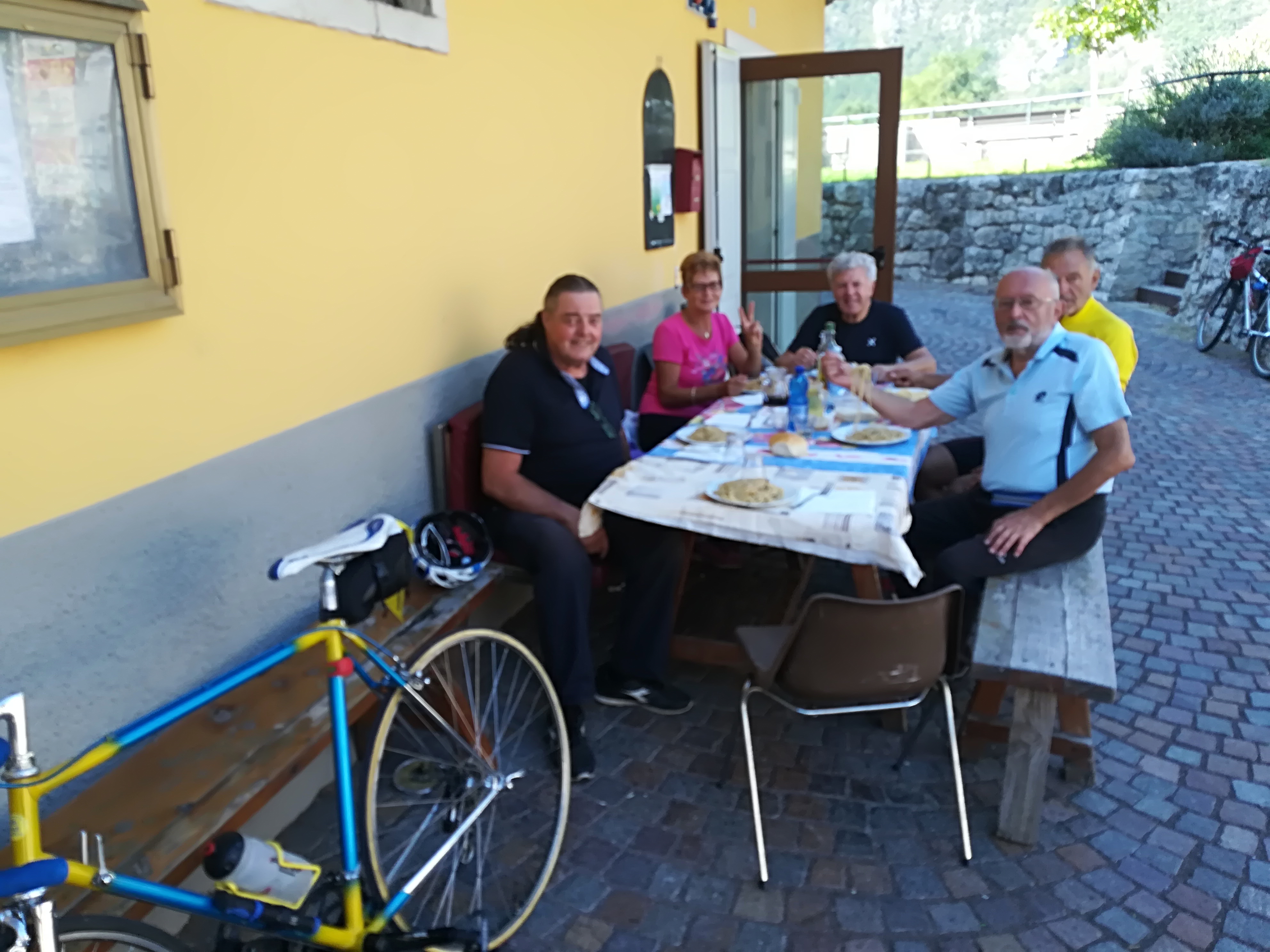Per farla breve, in 55 km (da casa) raggiungiamo Borghetto, dove Adelio era già ai fornelli per allestire una eccezionale spaghettata alle sarde. Mentre apparecchiamo, si avvicina a noi una coppia di ciclisti – marito e moglie – dallo sguardo spaesato, sperso e affamato: “Scusate … ma per mangiare? La trattoria è chiusa …”. “Un momento, dico io, lasciatemi vedere ..” Ne parlo ad Adelio ed è fatta: aggiungi due posti a tavola! Insomma, si è ripetuta la scena del 2015, quando gli affamati spaesati eravamo noi tre!