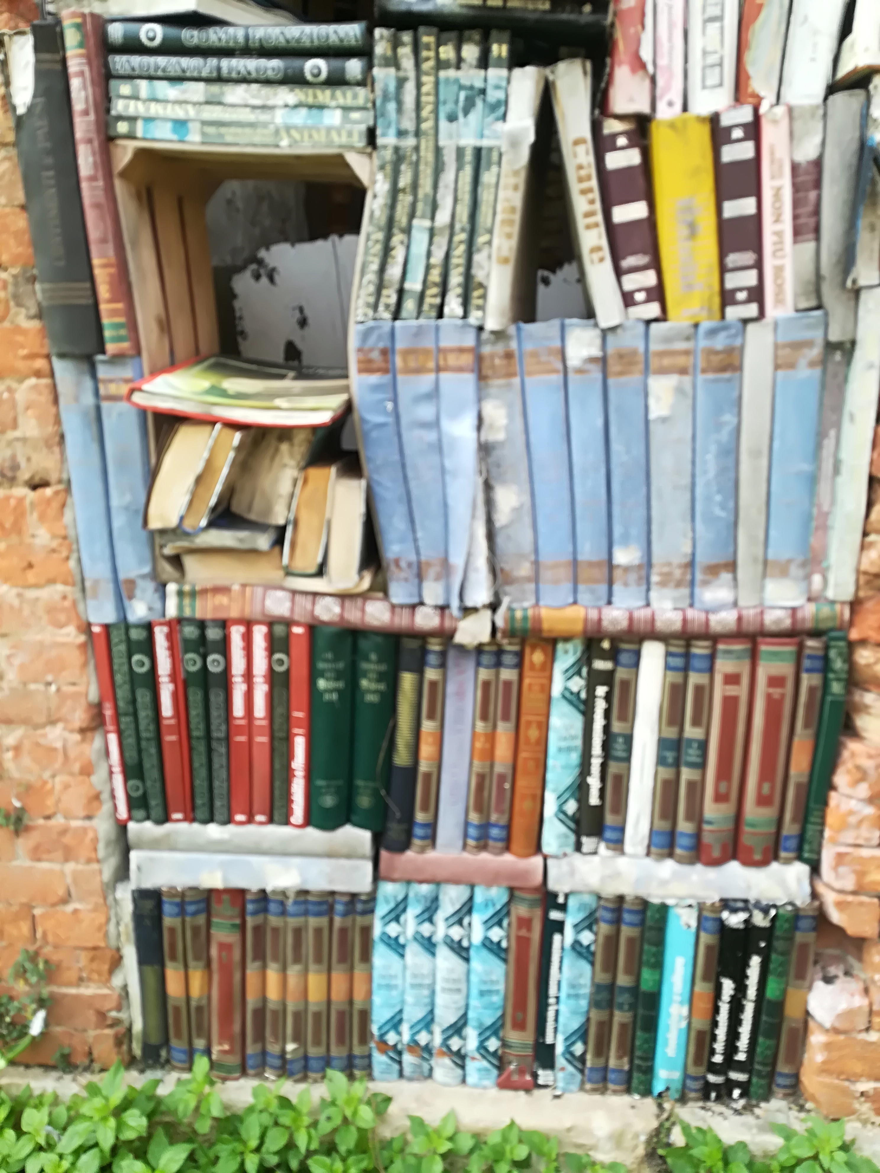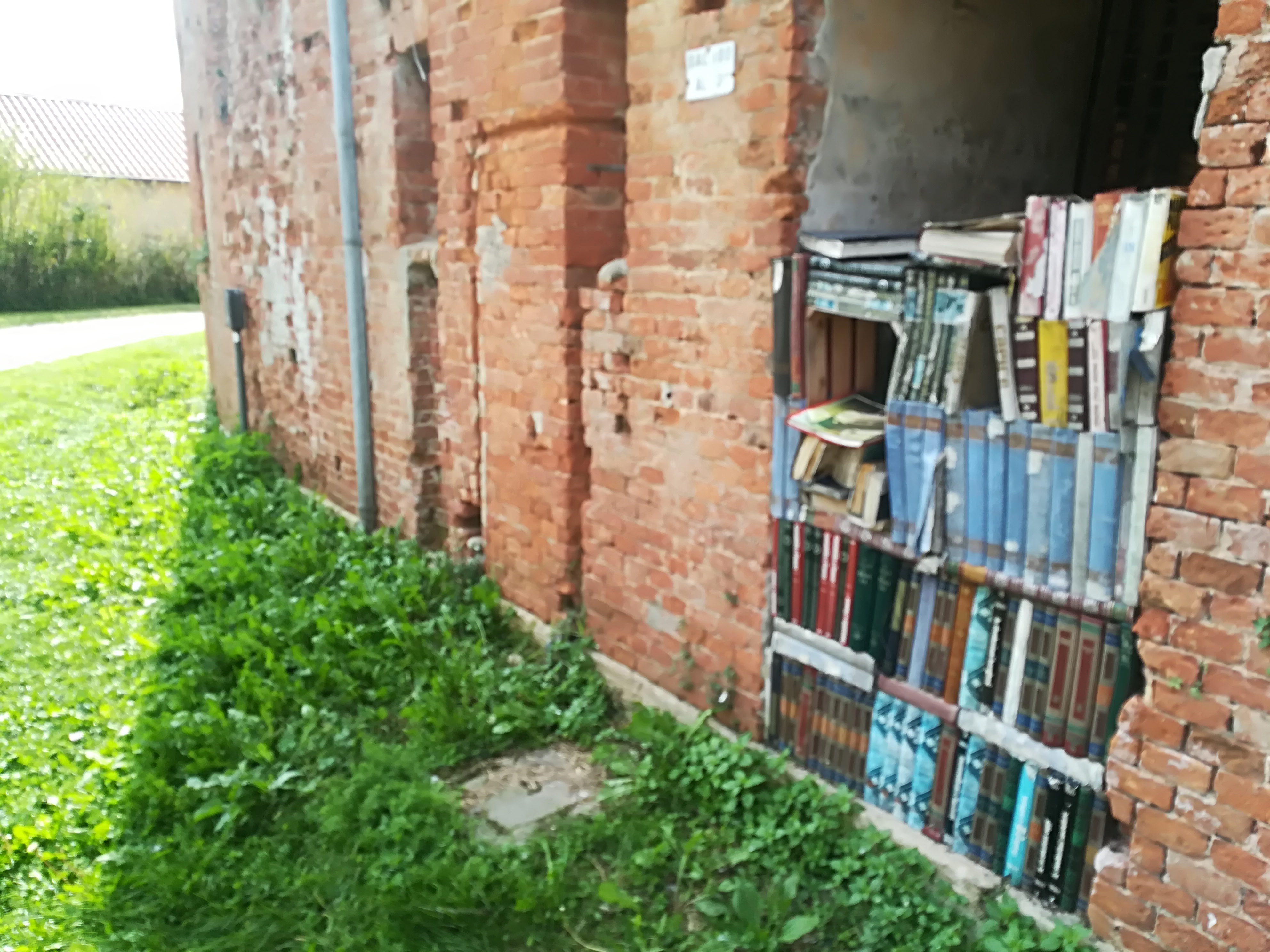Mi muovo con discrezione perché quello che formalmente è un bene pubblico abbandonato di fatto è il terreno di abitazioni private. Varcato il portale di una recinzione esterna, il mio sguardo è attratto da una … libreria open air, a cielo (quasi) aperto: libri ben ordinati su scaffali fra pareti di mattoni, all’aperto. Libri che evidentemente non hanno trovato posto all’interno delle case improvvisate ma che nessuno si è sentito di bruciare o portare al macero.