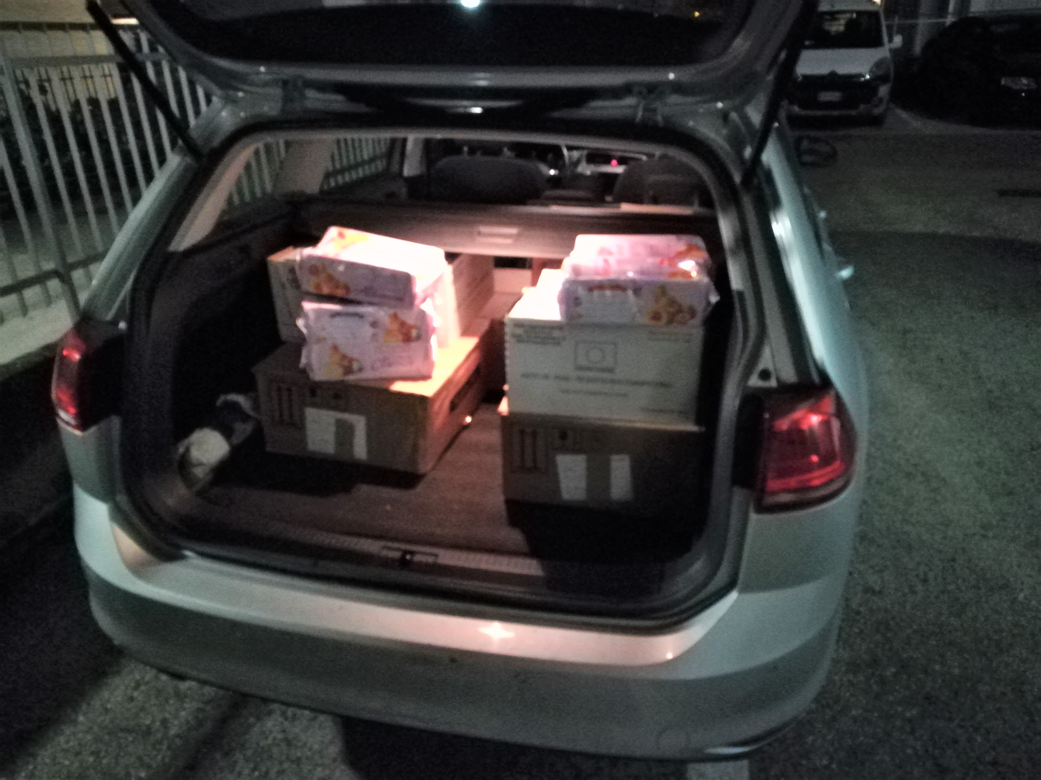 Il magazzino: molti scaffali ben ordinati, molti scatoloni già predisposti e contrassegnati con i numeri 2, 3, 6 riempiti diversamente a secondo del numero dei destinatari di ogni pacco. E poi cibi freschi: latte, frutta, verdura, pane, biscotti etc. In un angolo si intravede una mini cucina, per i pasti dei volontari addetti al lavoro di immagazzinaggio e distribuzione, che operano diretti da una signora molto ben organizzata e decisa: su di un foglio costei ha l’elenco di chi ha richiesto aiuto e in che misura e in quattro e quattr’otto il portabagagli della mia auto è completamente riempito. Fatto il carico, inizia il nostro giro di distribuzione: Italiani, Kossovari, Pakistani: ecco i nostri destinatari finali di ieri sera. Dalle 17.30 alle 19.30, casa (mia) – casa.