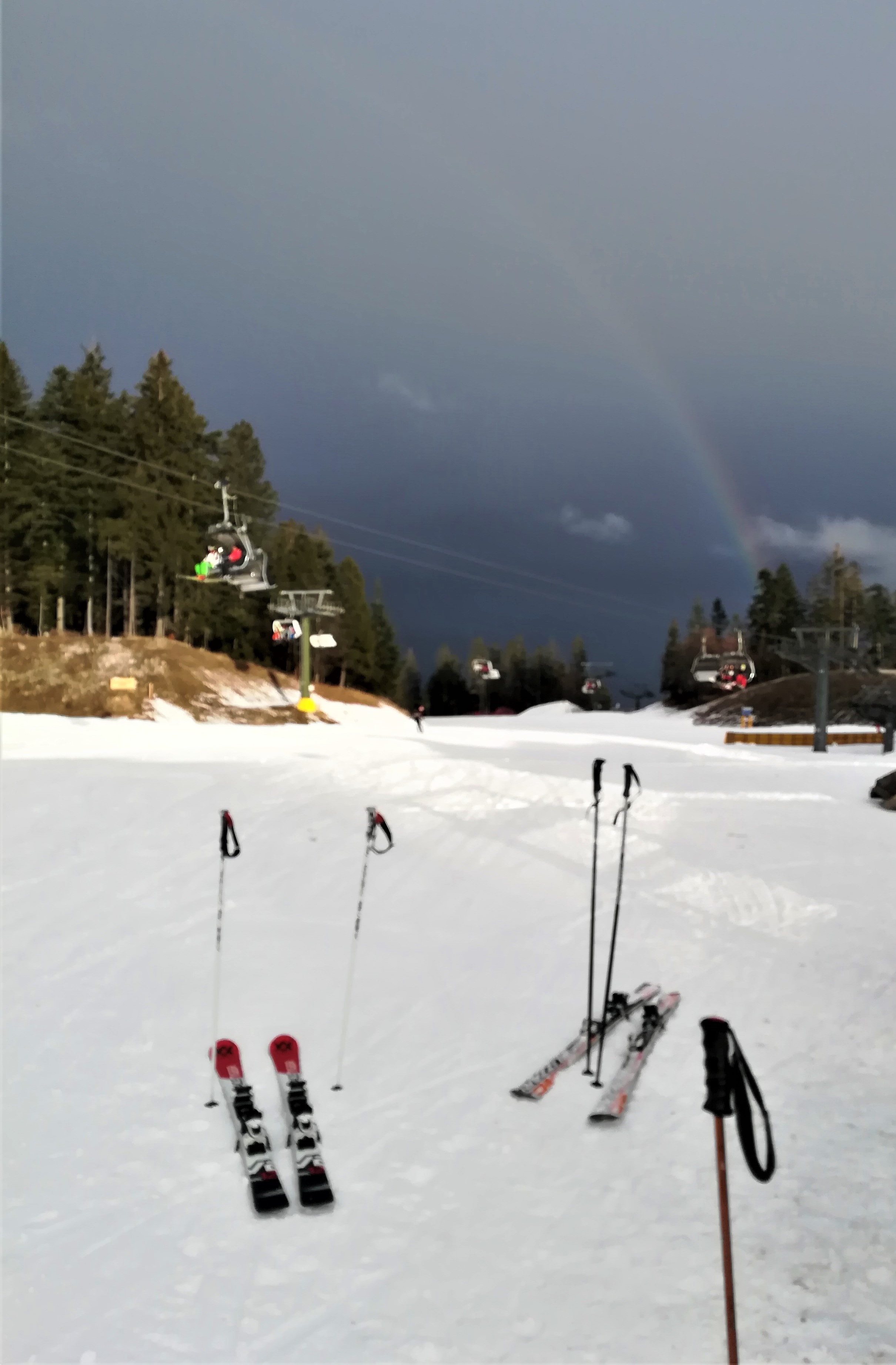 Dopo la sosta ho ripreso a sciare ma il forte vento ha fatto chiudere gli impianti alti, la gente si è super-concentrata sulle piste basse (affollatissime), la temperatura si è alzata a causa del foen, in cielo è comparso un arcobaleno, la neve è diventata pesante ed io sono tornato a casa. Il Signore lettore misterioso, abita a Milano, ha una casa qui vicino, a Cavedago, spero che si faccia vivo visto che gli ho rifilato un mio biglietto da blogger, che mi scriva (riccardo.lucatti@hotmail.it) … a lui auguro comunque Buona Lettura, Buone Letture e Buon Natale!