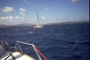 Altri velieri, tutti di dimensioni maggiori delle mie, seguono la stessa rotta, con lo spinnaker a riva. Ci sentiamo subito ingaggiati (va bene che siamo in crociera, ma tant’è…). Stralliamo al massimo il nostro spinnaker, mentre gli altri poggiano un po’. Indi lo ammainiamo e guadagnamo qualche miglio di bolina. Quindi diamo di nuovo spi e puntiamo sull’isola di S. Maria, la raggiungiamo e la scapoliamo, mentre gli altri devono fare un bordo sotto costa: abbiamo vinto questa insolita regata!