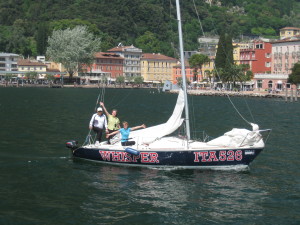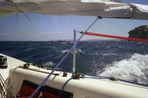 Finalmente arriva anche il maestrale! In spiaggia sono 20-25 nodi. Fuori si superano i 30. Riccardo, emozionatissimo, mi raggiunge a nuoto e lo misura con l’anemometro. Si sente osservato dalla spiaggia da cento occhi che si domandano se siamo matti o veramente bravi. Mi arma con cura. Sta attento a non scivolare sulle cime e cimette di cui sono pieno: movimenti lenti, studiati, da professionista, proprio come quando, in Germania, sotto gli occhi di un tedescone alto due metri si era dovuto mettere al volante di una grossa Mercedes con il cambio automatico presa a noleggio. Non deve far fare brutta figura al nostro Maestro Garda, anche perché a poppa porto ben leggibile il nome del mio circolo “FRAGLIA VELA RIVA” spesso interpretato e registrato nei porti francesi come il mio nome, al posto di Whisper. Due mani di terzaroli. La randa issata al vento fileggia rumorosamente. Idem il fiocco. Un ultimo controllo alle scotte ed alle volanti, indi Riccardo libera la prua dall’ormeggio e lo trattiene in mano arretrando verso poppa. Io mi traverso: lui lascia l’ormeggio e salta al timone. Via!…è fatta, abbiamo decollato con eleganza.