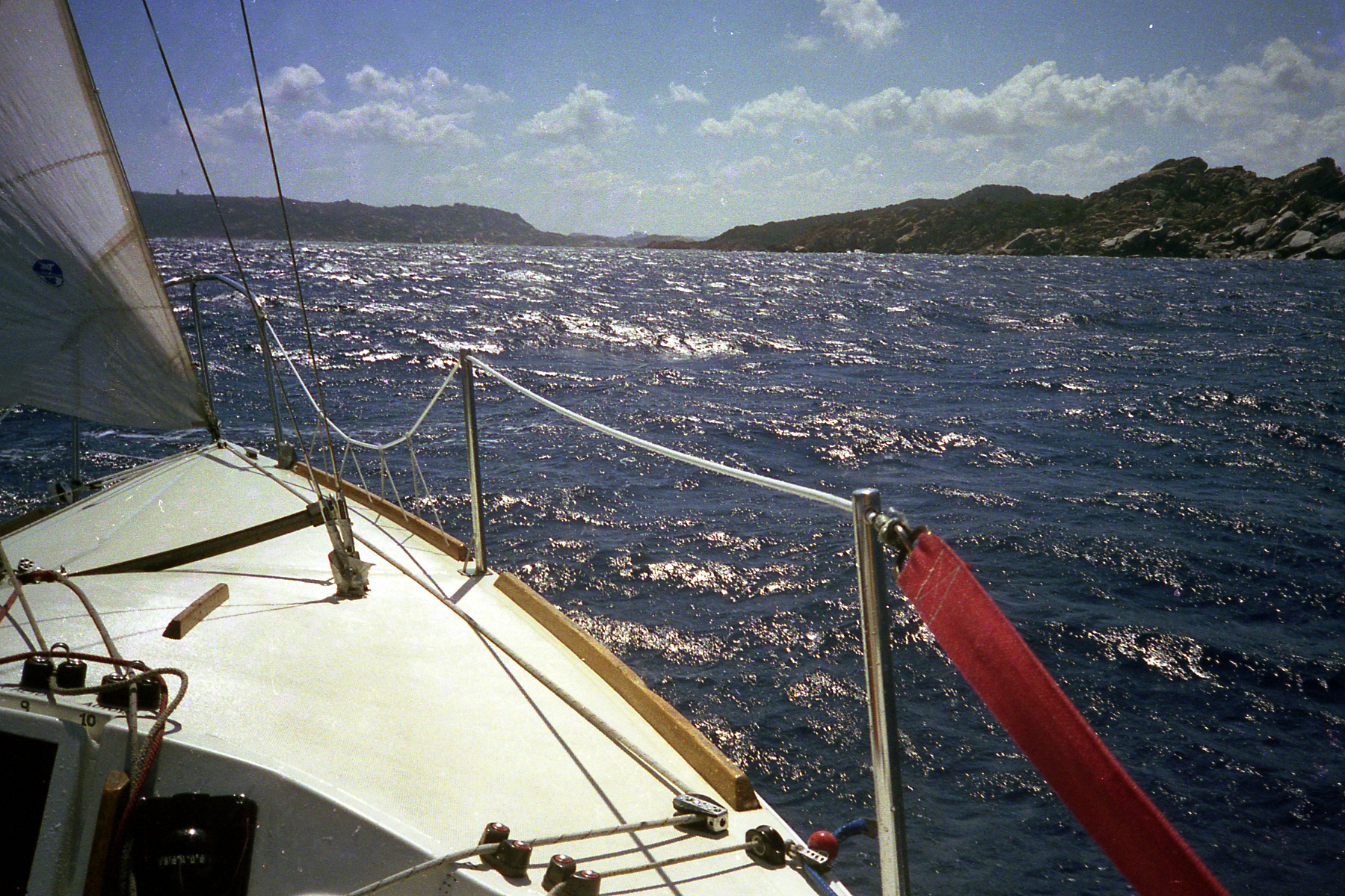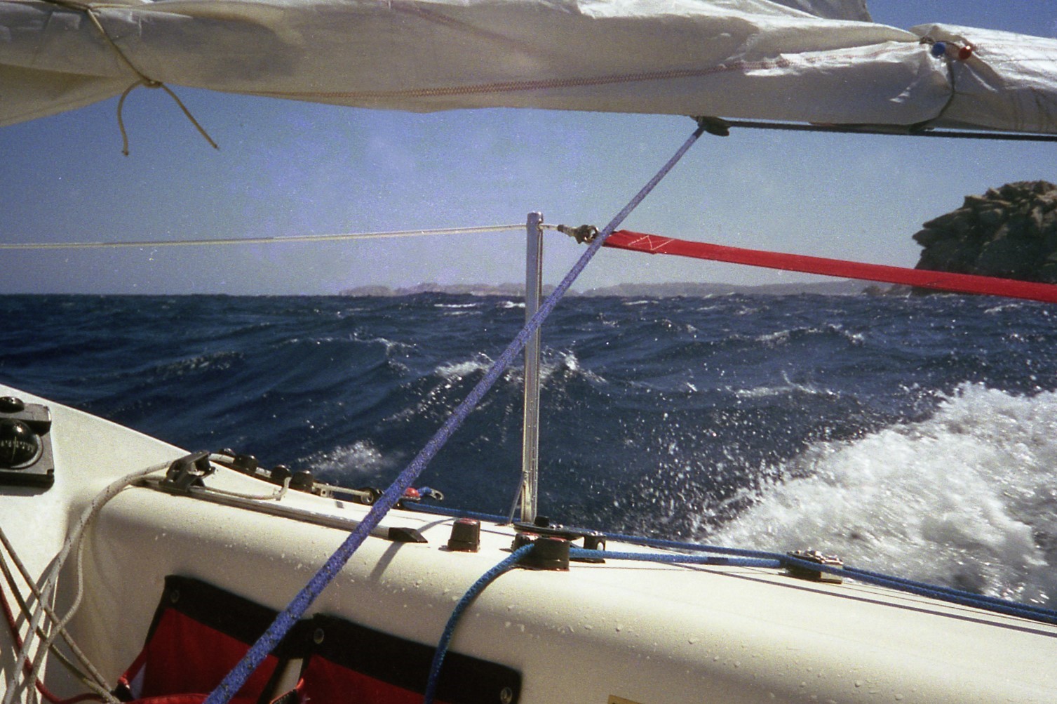 E’ il 28 agosto. Devo riportare il Fun in Toscana, e, grazie alle informazioni telefoniche di Meteo Mursia di Portofino, cui sono abbonato, so che sta per arrivare una mistralata seria. Passeggio nervosamente nel porto di Palau aspettando l’amico Guglielmo in arrivo dal continente per accompagnarmi nella traversata. Ho fretta di partire per superare le Bocche di Bonifacio prima che Lui ci arrivi addosso. Guglielmo arriva alle 09,30. Riusciamo a salpare alle 11,00 aiutando le vele con un po’ di motore. Caprera, Santo Stefano, Maddalena, Spargi sfilano lentamente mentre procediamo verso nord. Siamo in mezzo alla Bocca Grande. Il vento è debole da est, ma sul mare si è formata un’onda lunga da ovest. Io vorrei navigare più sottocosta: tuttavia, poichè Guglielmo ha fretta di guadagnare miglia verso casa, ci teniamo su di una rotta più diretta, abbastanza al largo. Sono le ore 14,30. Il cielo non presenta alcun aspetto caratteristico. Telefono a Meteo Mursia che mi riconferma la previsione. Nel frattempo infatti il vento è girato da ovest ed è ancora assai debole, ma alcune barche a vela sottocosta, sopravvento di alcune miglia sulla mia sinistra, procedono verso nord ad una velocità sospetta se si tiene conto che noi ci stiamo ancora faticosamente aiutando con il motore. Decido immediatamente di attuare le misure di emergenza: indossiamo i giubbotti, chiudo il tambuccio, prendo due mani di terzaroli e lascio il fiocco (errore: avrei dovuto prendere anche la terza mano ed issare la tormentina). Pochi minuti dopo Lui, il Re Mistral arriva. Per nostra fortuna abbiamo il vento al traverso, con la prospettiva favorevole di uscire dalle Bocche, di proseguire sulla rotta prestabilita e di ridossarci sempre di più. Guai se avessimo dovuto bolinare, procedere di poppa, allontanarci dalla rotta o essere costretti ad affrontare l’onda del mare aperto!