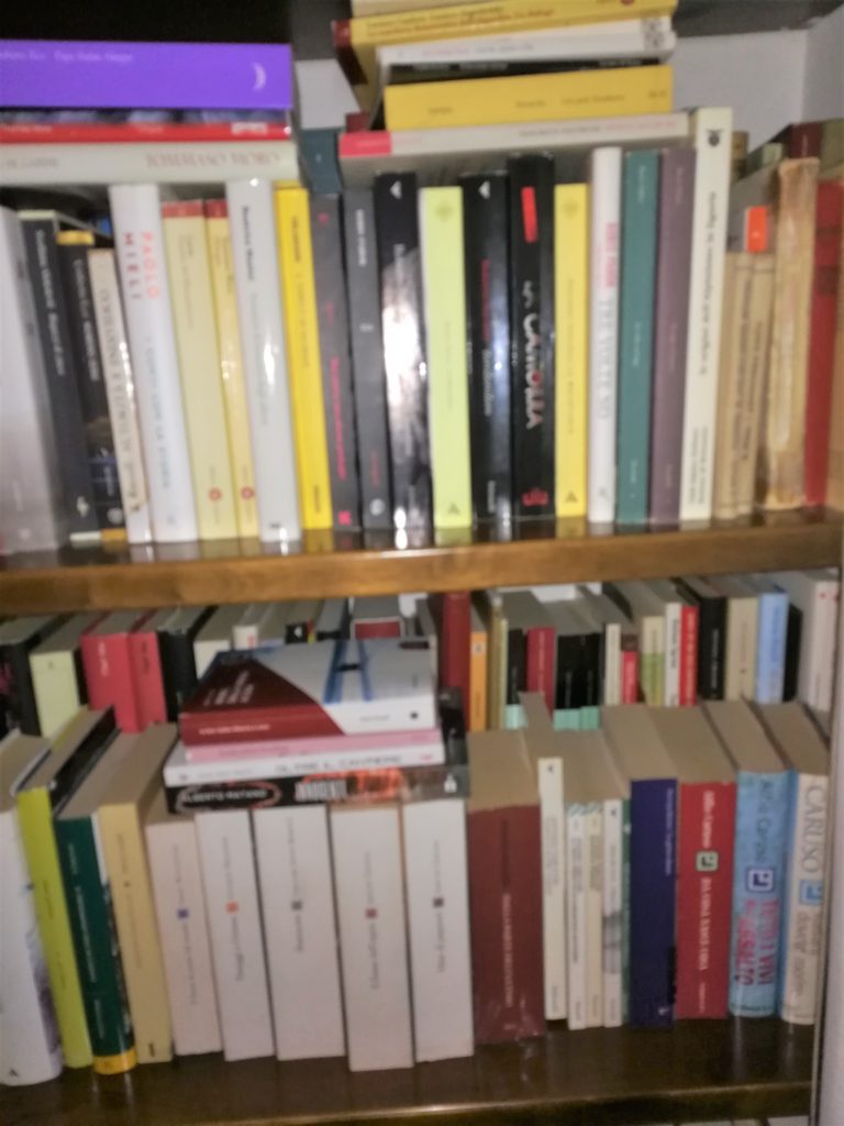 Gli scaffali, si diceva: hanno una portata limite. Nei miei ho creato una doppia fila e quelli della fila posteriore – grazie ad una tavoletta di compensato rialzata e posta alla loro base – sono rialzati a fanno capolino oltre i libri delle poltronissime: in tal modo li ho resi visibili ed ho raddoppiato la portata della mia platea. Ho poi creato altro spazio regalando molti libri della mia gioventù alla biblioteca di una scuola media. Ma non basta: gli ulteriori arrrivi stanno di traverso, dovrò provvedere.