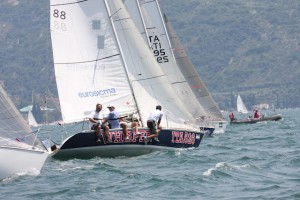 Di bolina, in partenza in una regata. Ma qui siamo sul Garda, questa volta con vento medio (13 nodi)