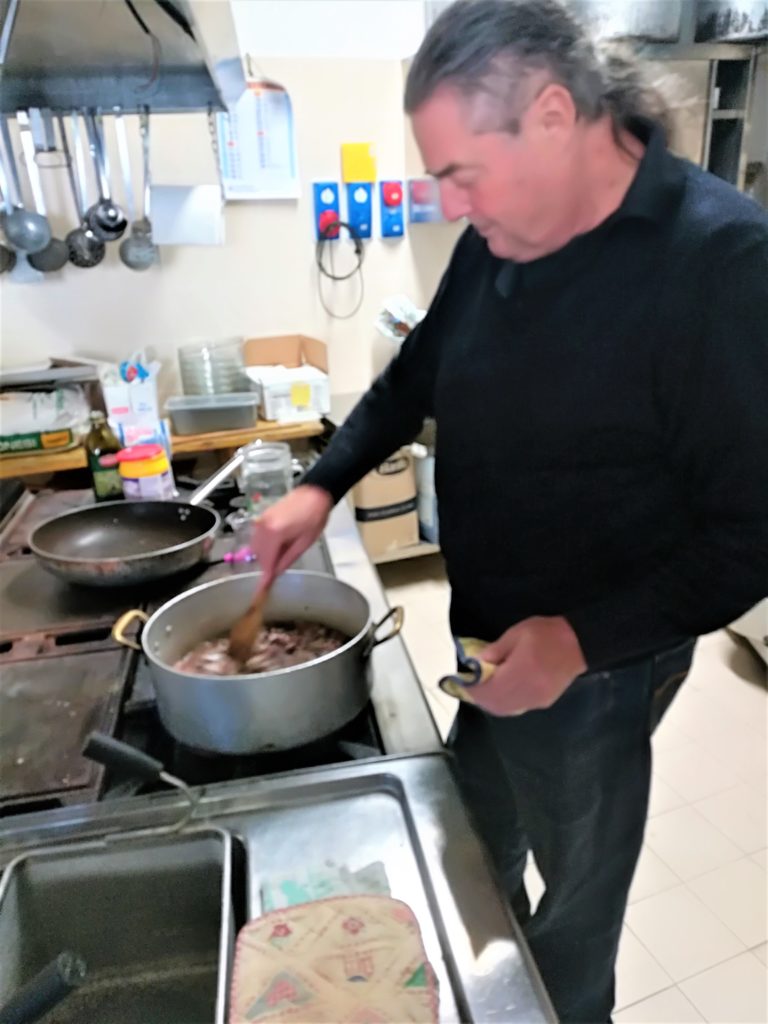 Ci sediamo al tavolo all’aperto della “nostra” Pro Loco (siamo regolarmente tesserati!) acconti dall’amicizia dei nostri consueti ospiti. Oltre a noi, “programmati e prenotati”, passa qualche paesano, telefona a casa “Cara, non vengo a pranzo” e si unisce a noi. Antipasto misto, spaghetti alle sarde, vino e caffè. Per frutta un amico ha portato un cesto pieno di ciliegie.